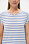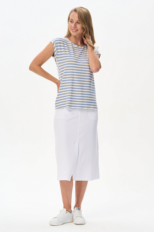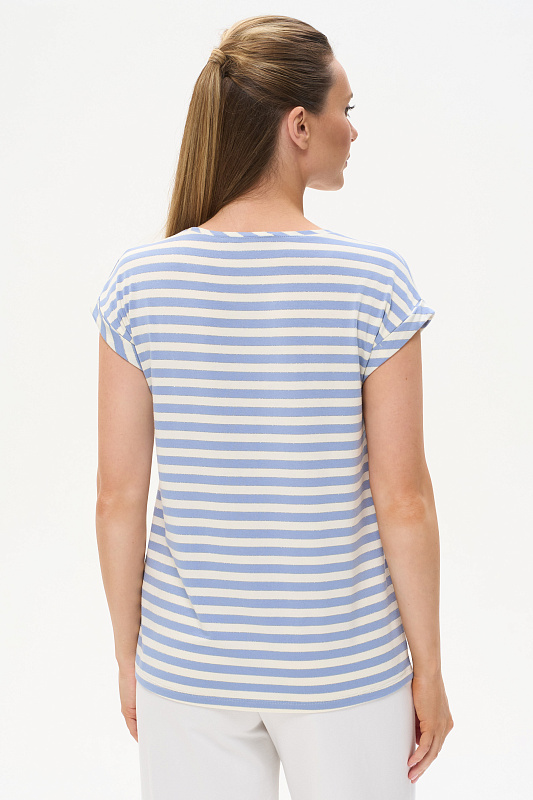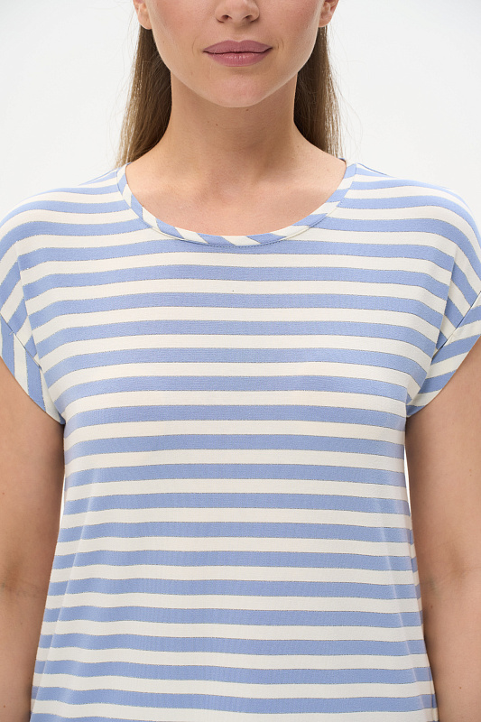 Блузка прямого силуэта из вискозного полотна в полоску - широкая голубая и тонкая серебристая. Модель со спущеной линией плеча, цельнокроеные короткие рукава с зафиксированными подворотами, круглый вырез горловины, длиной чуть ниже середины бедер. Универсальная, комфортная модель на любой случай. Рост модели 175 см.
