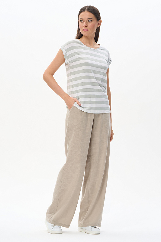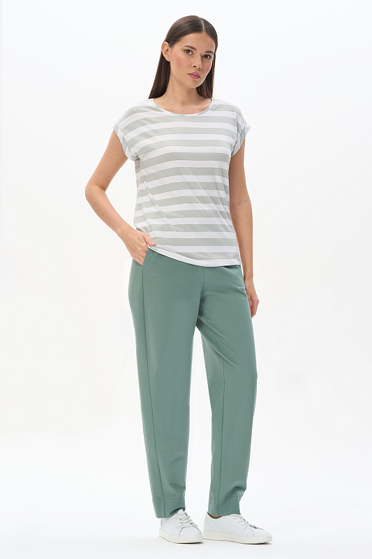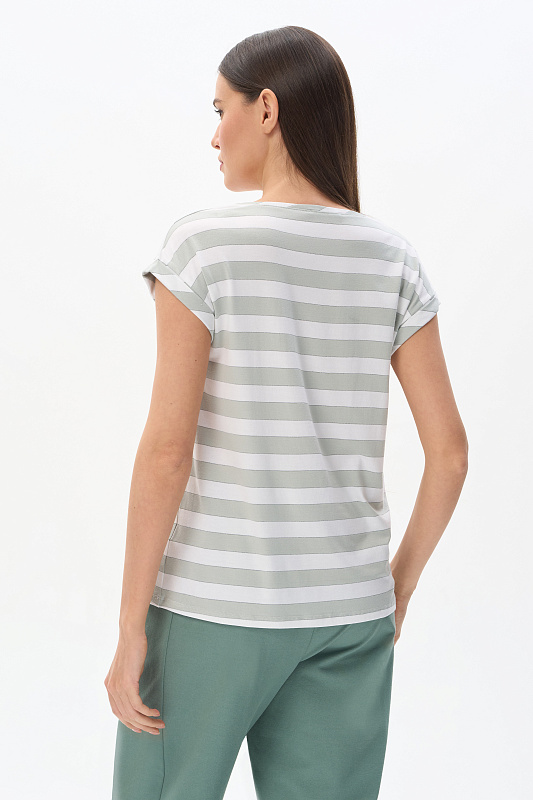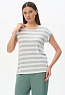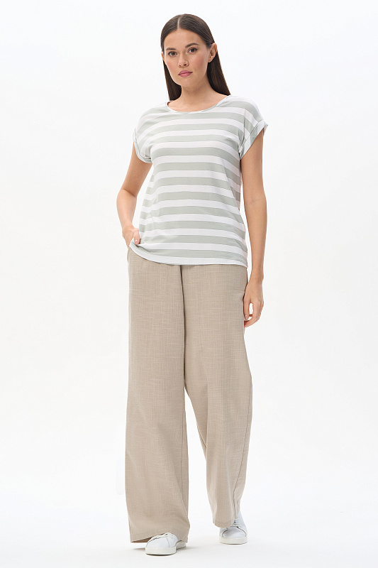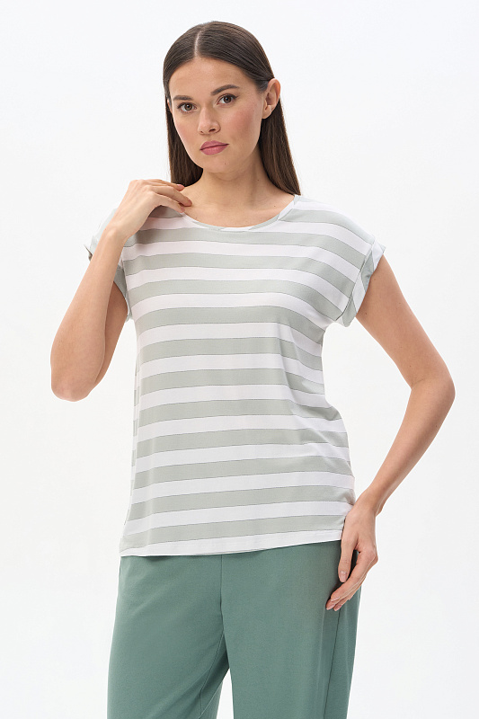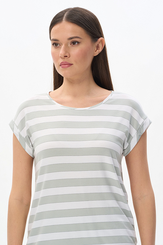 Футболка прямого силуэта из вискозного полотна в полоску 200 гр. Модель со спущеной линией плеча, цельнокроеные короткие рукава с зафиксированными подворотами, круглый вырез горловины, длиной чуть ниже середины бедер. Универсальная, комфортная модель на любой случай. Рост модели 175 см.