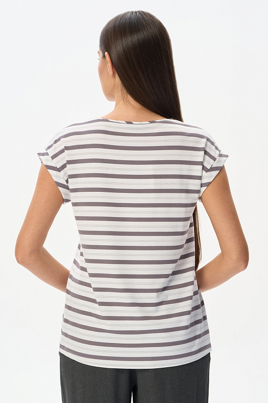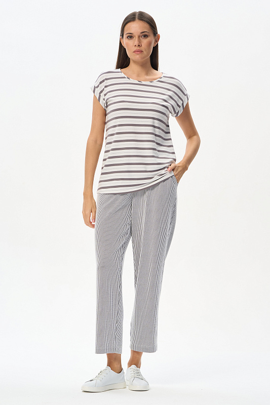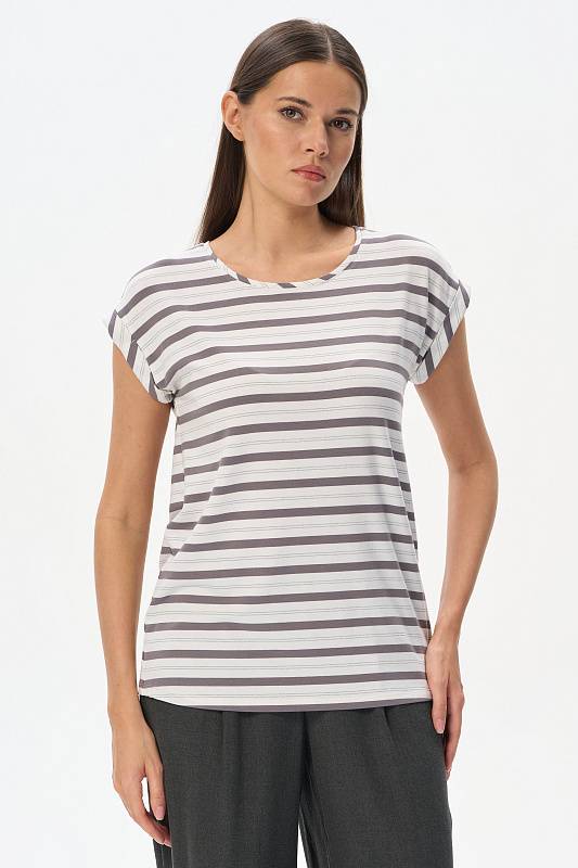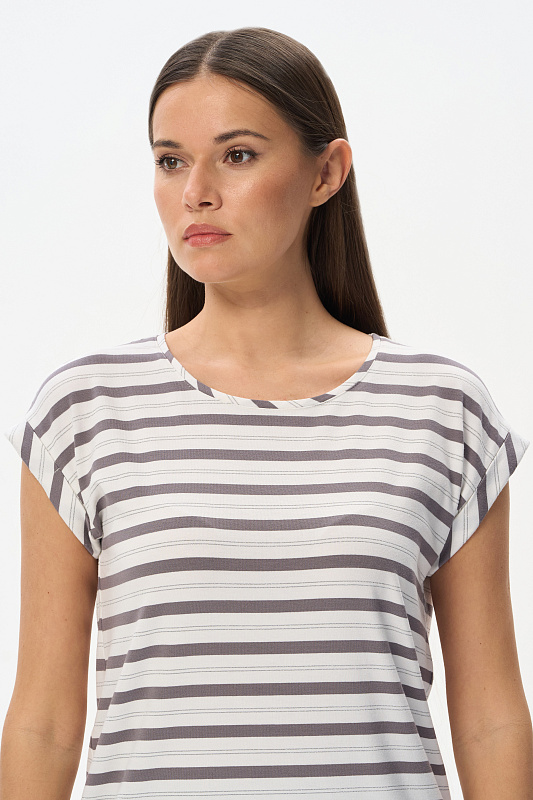 Блузка прямого силуэта из вискозного полотна в полоску. Модель со спущеной линией плеча, цельнокроеные короткие рукава с зафиксированными подворотами, круглый вырез горловины, длиной чуть ниже середины бедер. Универсальная, комфортная модель на любой случай. Рост модели 175 см.