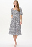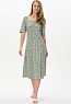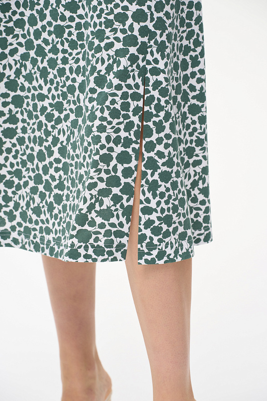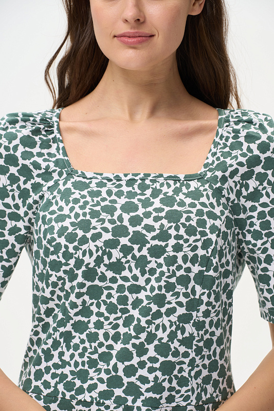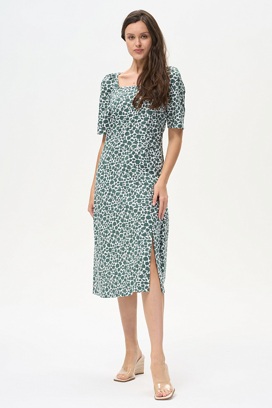 Платье полуприлегающего силуэта, выполнено из хлопкового трикотажного полотна. Фигурный вырез горловины - каре. Короткие втачные рукава. Спереди разрез в рельефном шве. Длина изделия ниже колена. Рост модели на фото 178см.