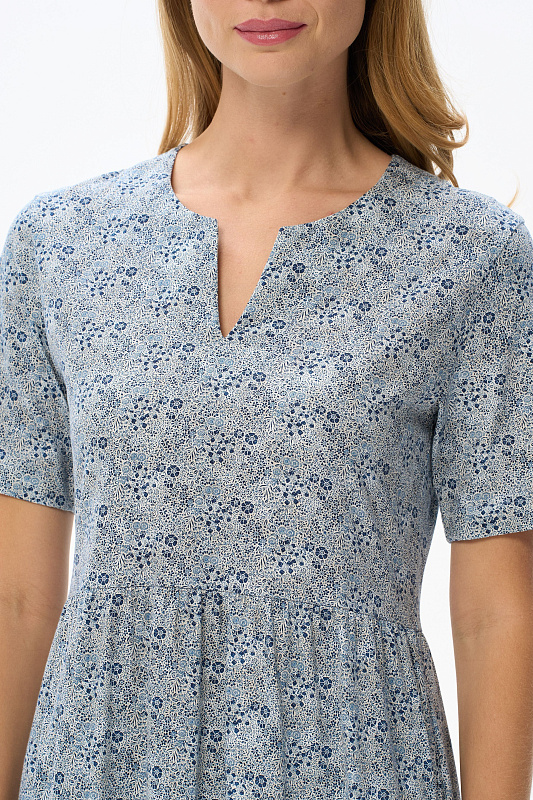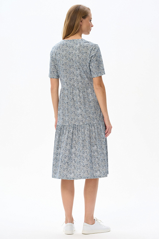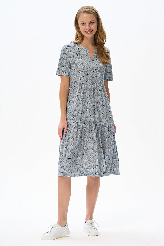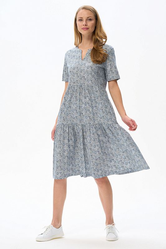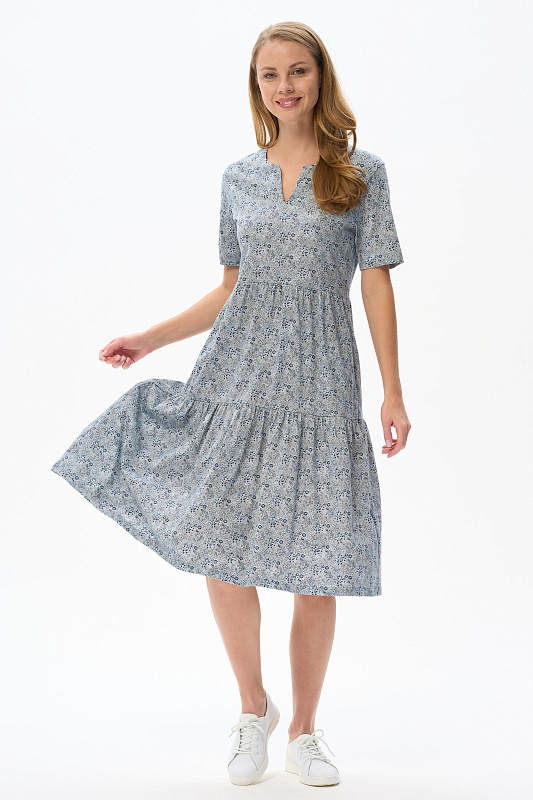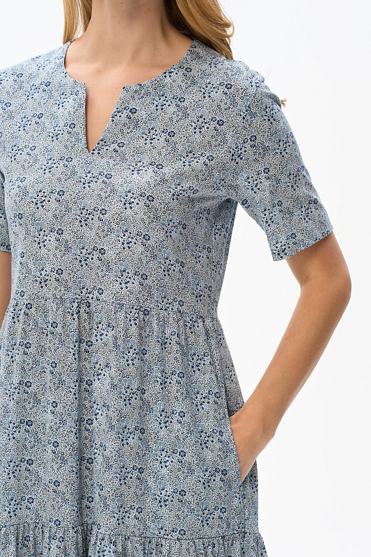 Комфортное ярусное платье, полуприлегающего силуэта из хлопкового полотна. Круглый вырез горловины, втачные короткие рукава, карманы в боковых швах. Рост модели 175 см.