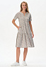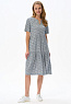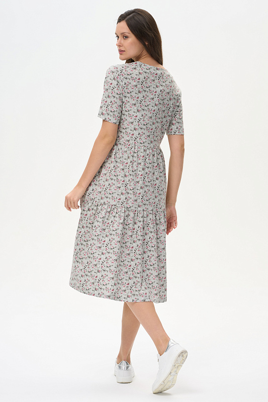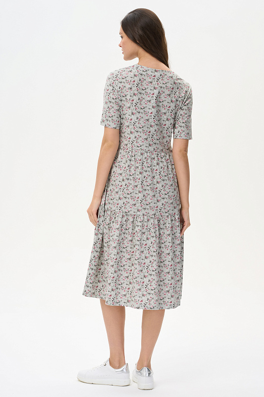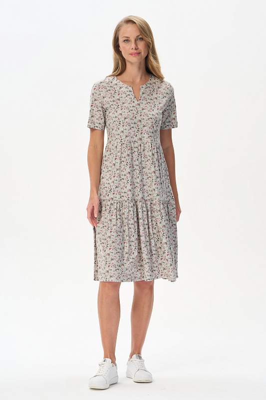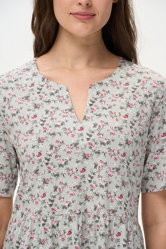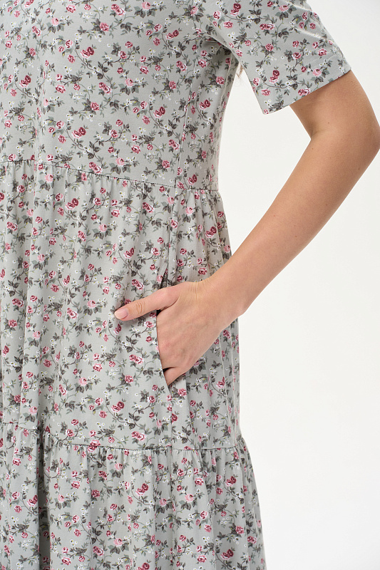 Ярусное платье из кулирки качества ПЕ 145 гр. Нежные розочки на оливковом фоне. Модель свободная, расширенного силуэта, круглая горловина с V-образным разрезом, короткие рукава, в боковых швах карманы, длина до колен. Женственное, лёгкое платье для города, дома и отдыха. Рост модели 175 см.