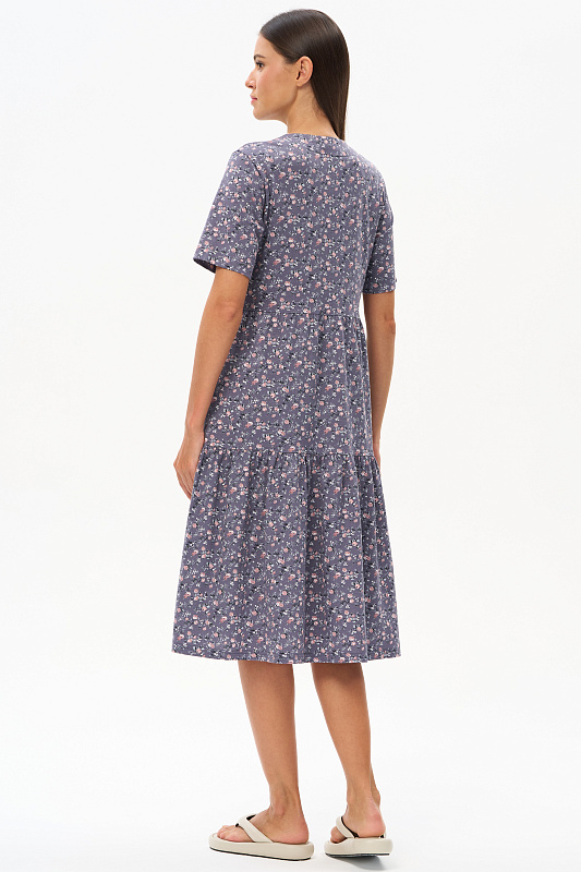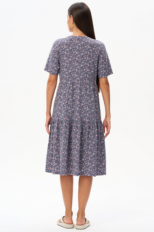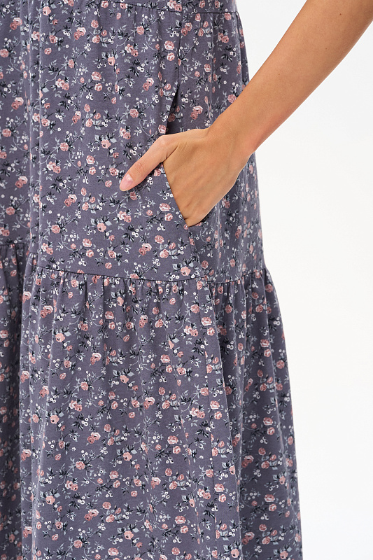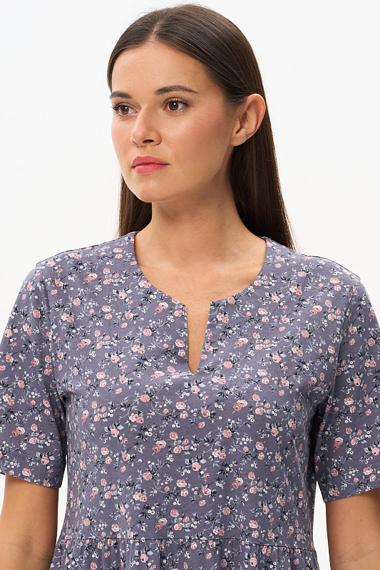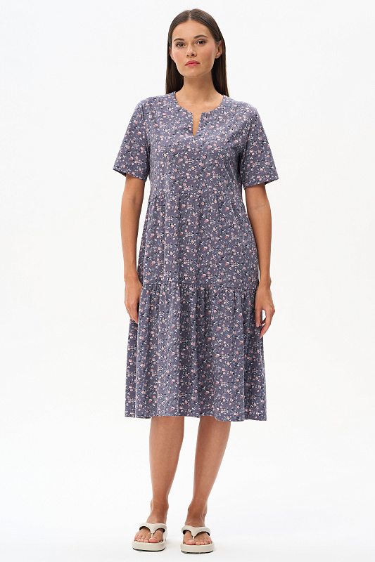 Ярусное платье из кулирки качества ПЕ 145 гр. Нежные розочки фоне фюме. Модель свободная, расширенного силуэта, круглая горловина с V-образным разрезом, короткие рукава, в боковых швах карманы, длина до колен. Женственное, лёгкое платье для города, дома и отдыха. Рост модели 175 см.