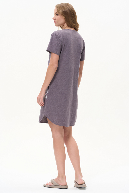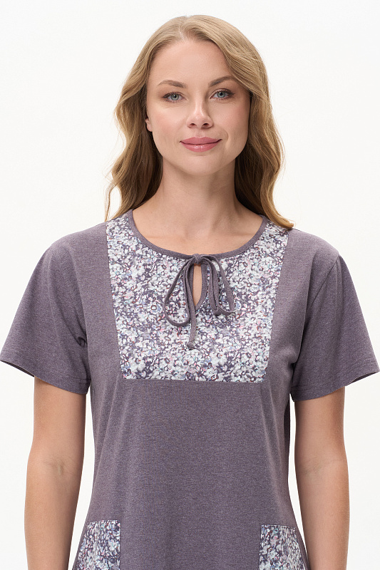 Платье А-силуэта из кулирки меланж качества ринг в комбинации с набивной кулиркой 145 гр. Модель свободная, расширенная к низу, круглый вырез горловины с завязками, фигурная кокетка накладные карманы. Короткие втачные рукава, фигурная линия низа обработана тонкой окантовкой, длина до колен. Комфортная модель для дома и отдыха, отлично сидит, подходит на любой тип фигуры. Рост модели 175 см