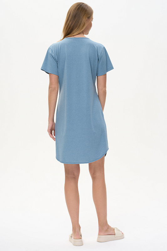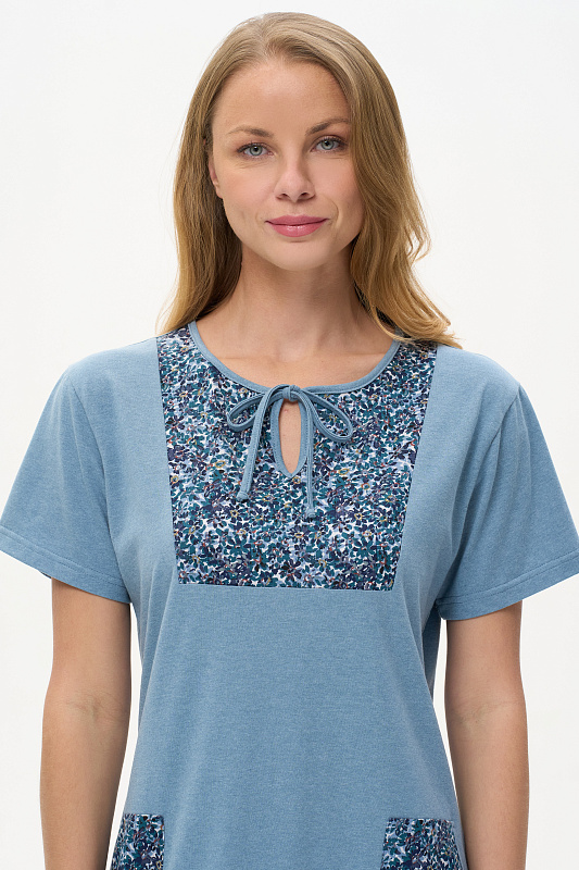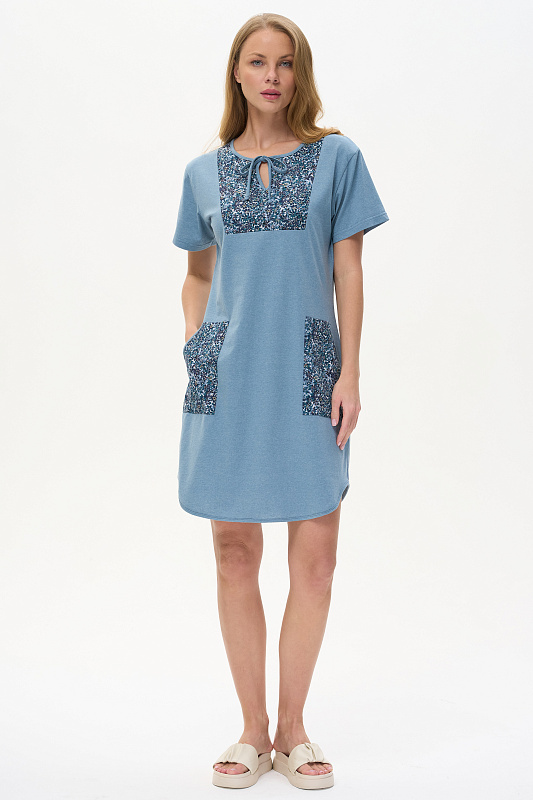 Платье А-силуэта из кулирки меланж качества ринг в комбинации с набивной кулиркой 145 гр. Модель свободная, расширенная к низу, круглый вырез горловины с завязками, фигурная кокетка накладные карманы. Короткие втачные рукава, фигурная линия низа обработана тонкой окантовкой, длина до колен. Комфортная модель для дома и отдыха, отлично сидит, подходит на любой тип фигуры. Рост модели 175 см