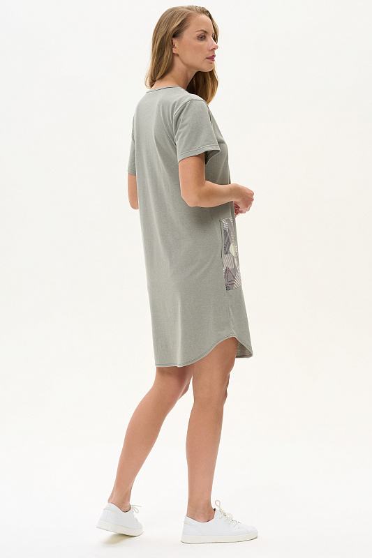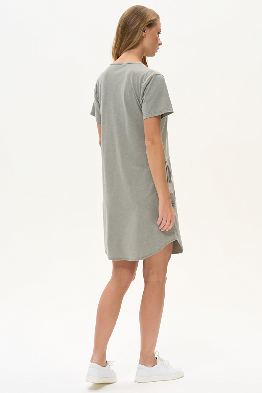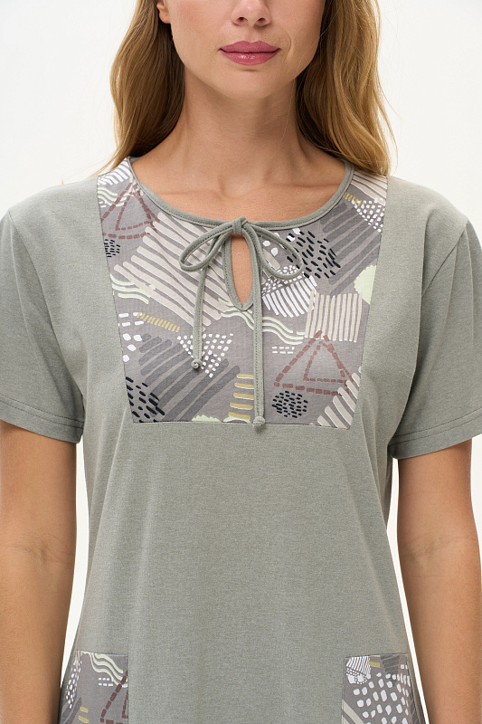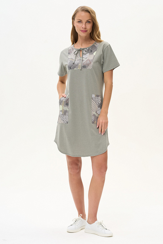Платье А-силуэта из кулирки меланж качества ринг в комбинации с набивной кулиркой 145 гр. Модель свободная, расширенная к низу, круглый вырез горловины с завязками, фигурная кокетка накладные карманы. Короткие втачные рукава, фигурная линия низа обработана тонкой окантовкой, длина до колен. Комфортная модель для дома и отдыха, отлично сидит, подходит на любой тип фигуры. Рост модели 175 см