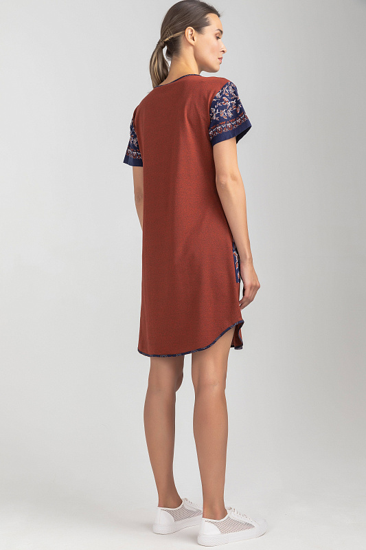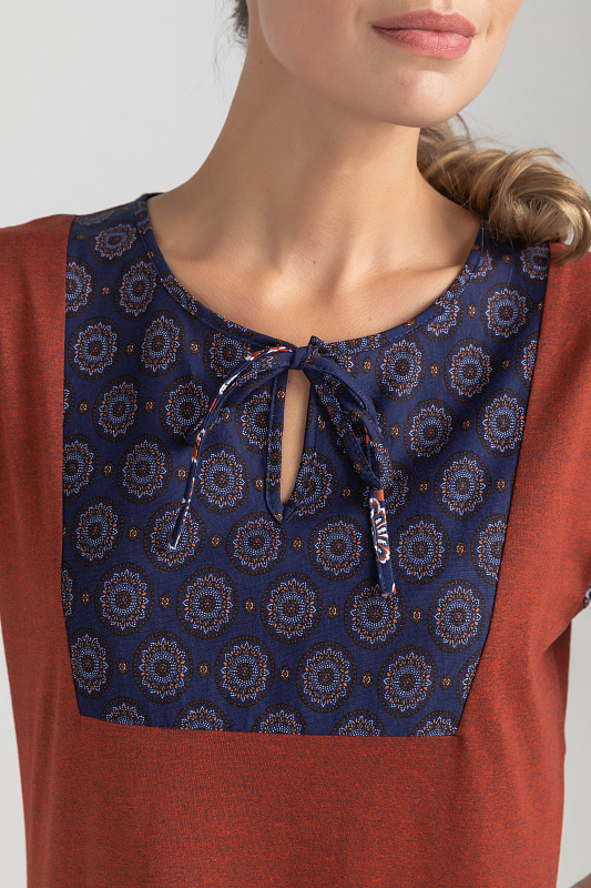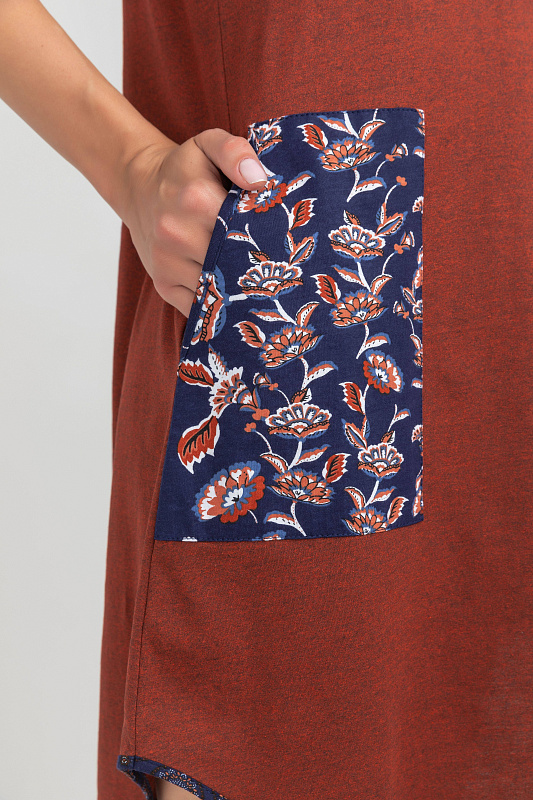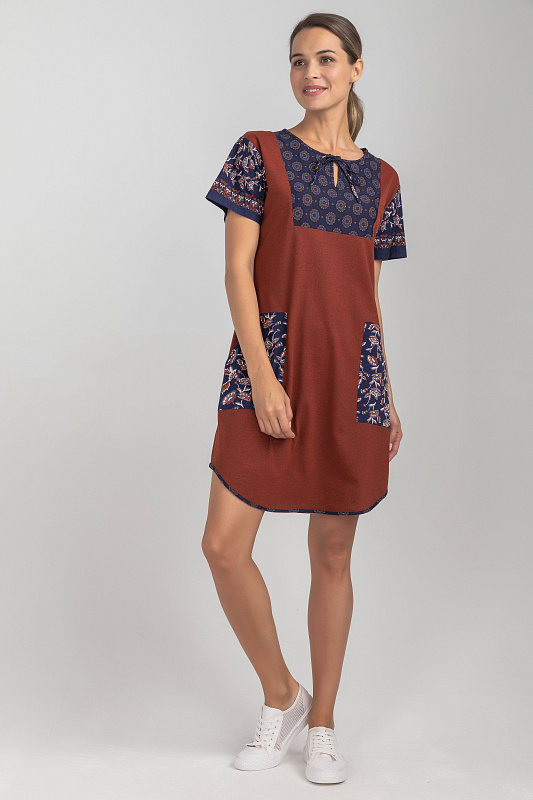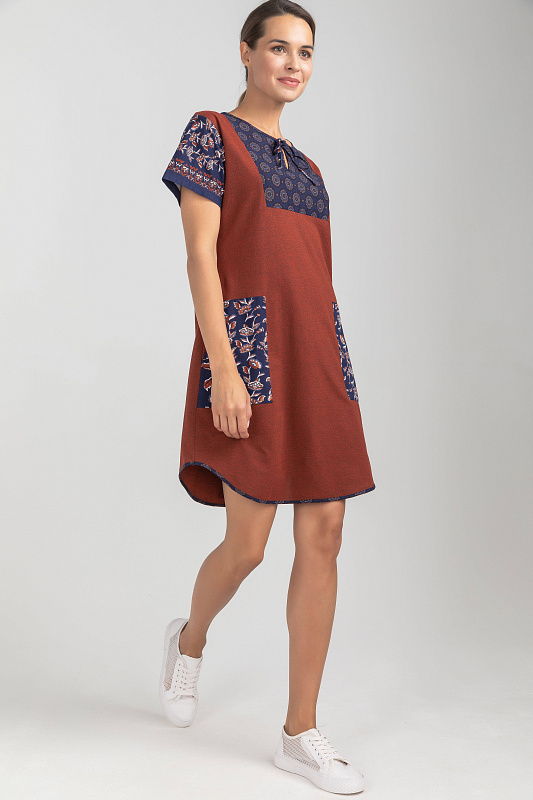 Платье А-силуэта выполнено из сочетания трикотажных полотен хлопкового и меланжевого качества пенье. Спереди фигурная кокетка с завязкой, накладные карманы. Короткие втачные рукава. Фигурная линия низа изделия окантована. Длина платья до колена. Рост модели на фото 177см.