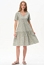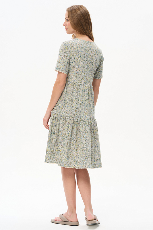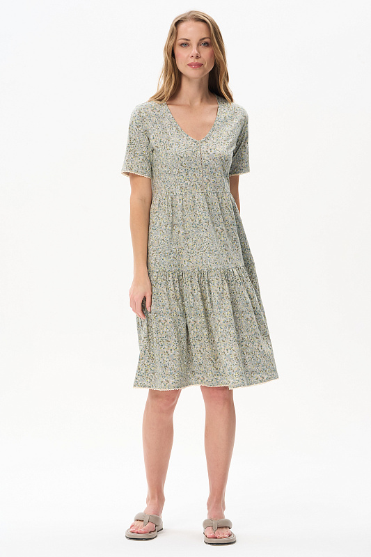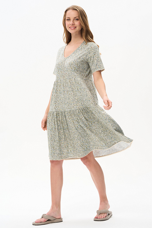 Ярусное платье из кулирки качества ПЕ 150 гр. Акварельные цветы в зелёных тонах. Модель свободная, расширенного силуэта, V-образный углублённый вырез горловины, короткие рукава, в боковых швах карманы, длина до колен. Ажурная мережка на полочке и хлопковое кружево по низу рукавов - трендовая нотка этой модели. Женственное, лёгкое платье для города, дома и отдыха. Рост модели 175 см.