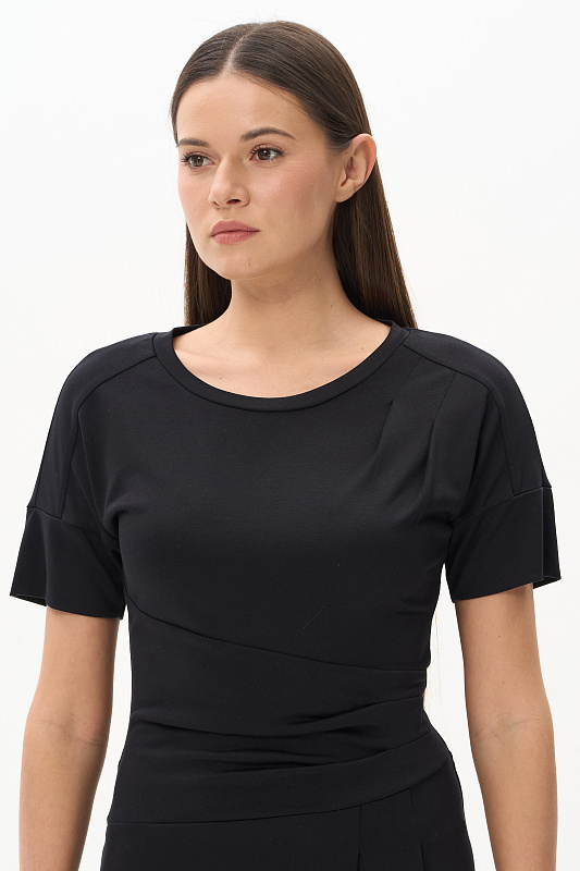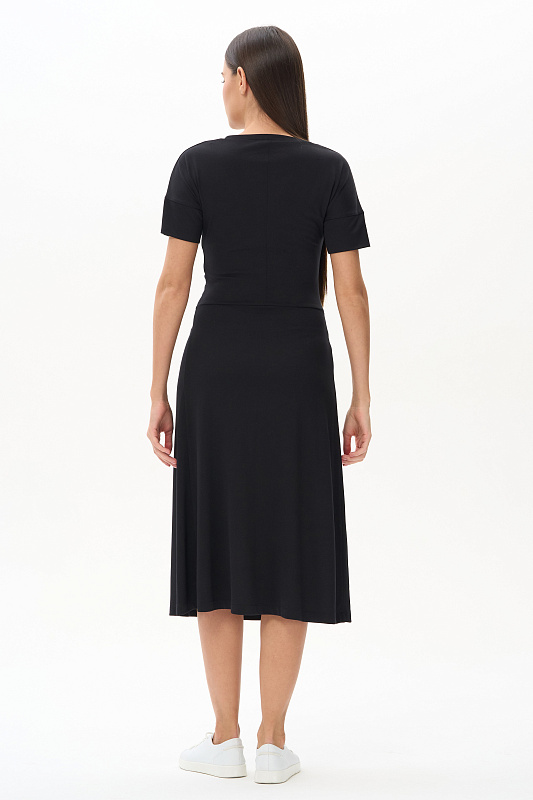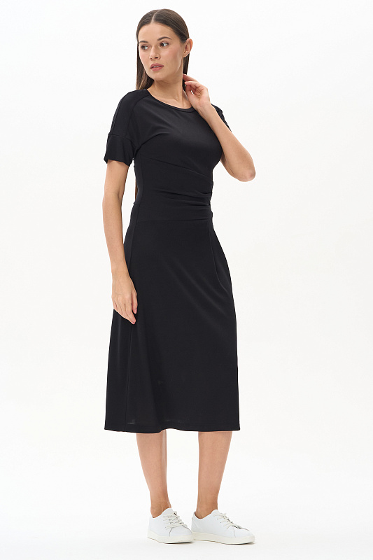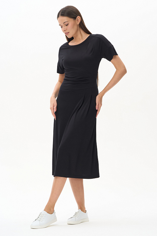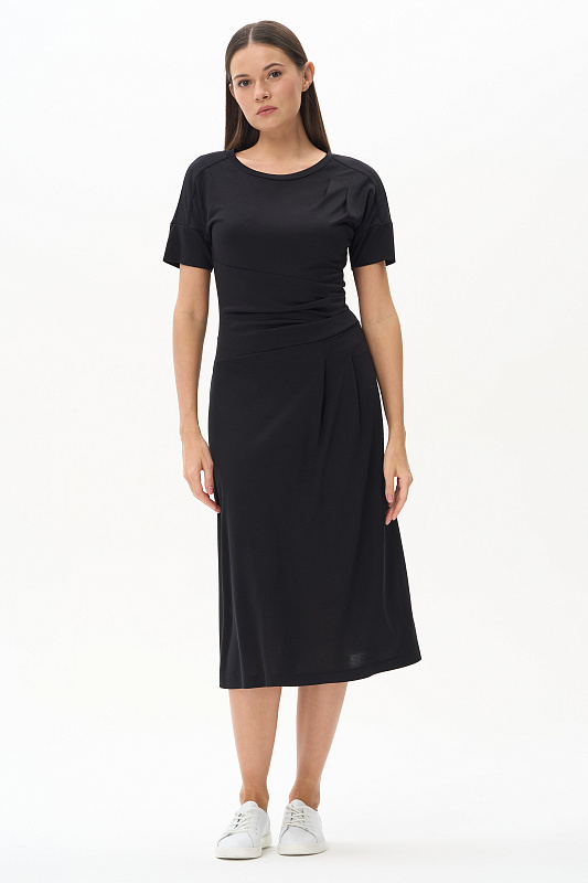 Платье из модала новой конструкции с ассиметричным решением. Спереди пояс-драпировка корректирует и скрывает животик, сзади отрезная талия. Рукава с погонами, длина корректируется отворотом. Идеальная модель на верхний и нижний тип фигуры.