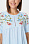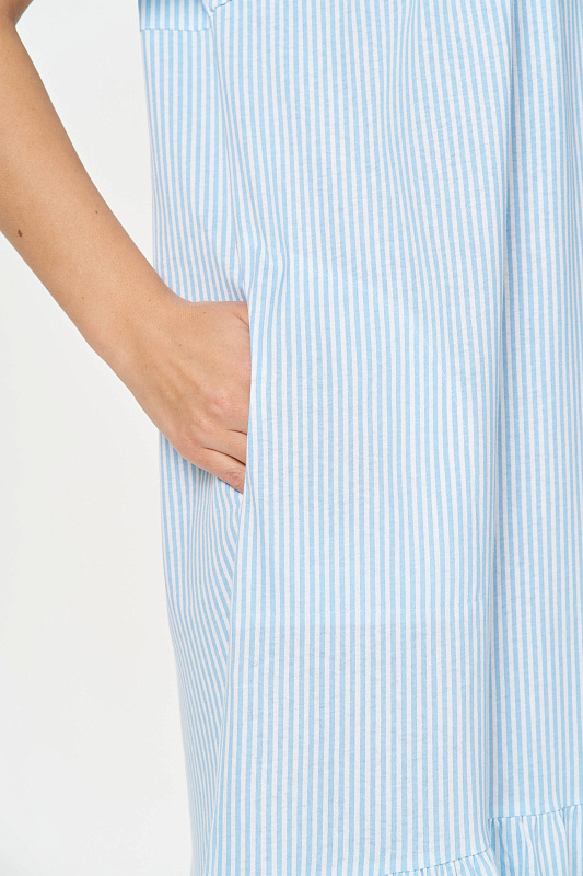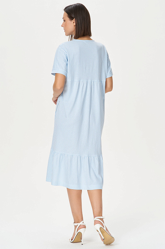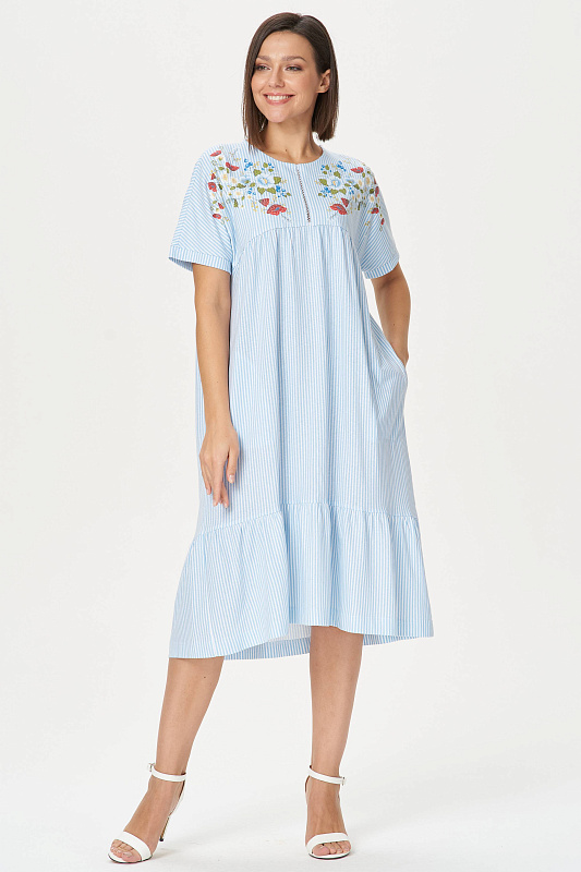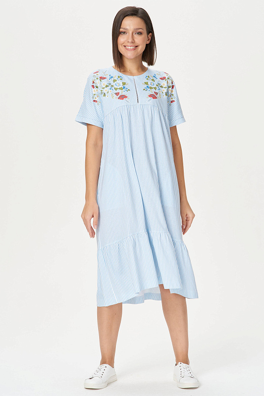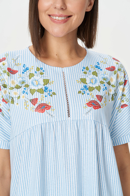 Платье расширенного силуэта из хлопкового трикотажного полотна. Круглый вырез горловины, цельнокроенные короткие рукава с манжетами. Спереди кокетка декорирована яркими принтами и мережкой по центру. В боковых швах карманы. Фигурная линия низа. Рост модели на фото 170.
