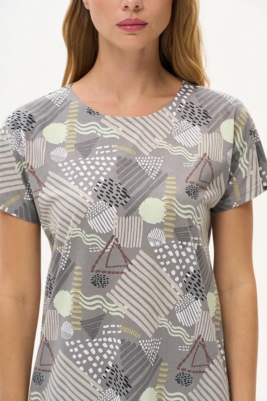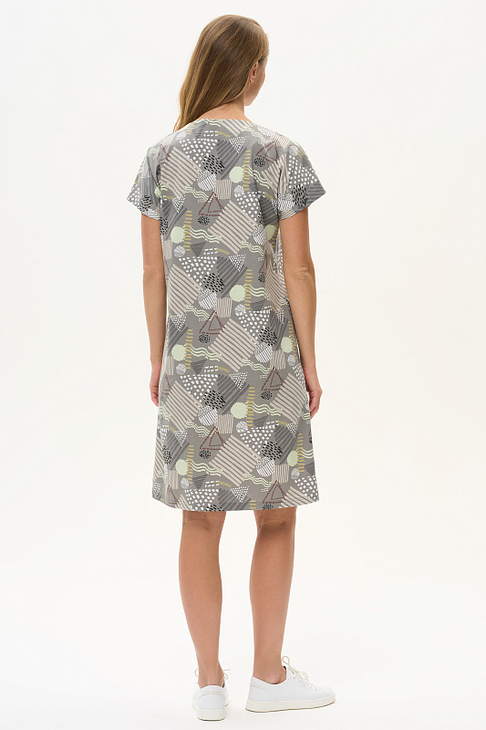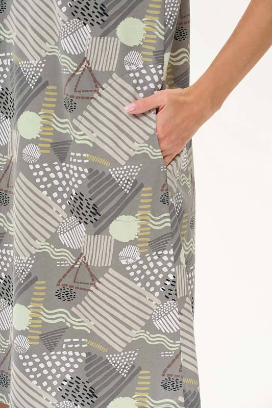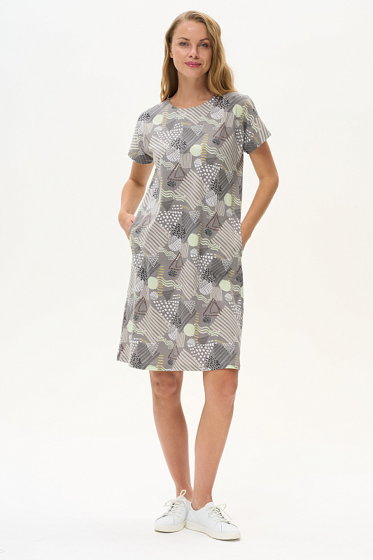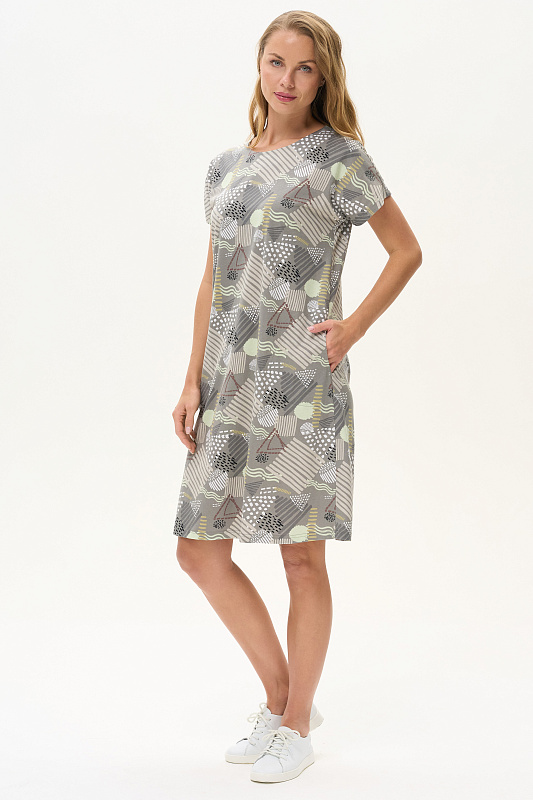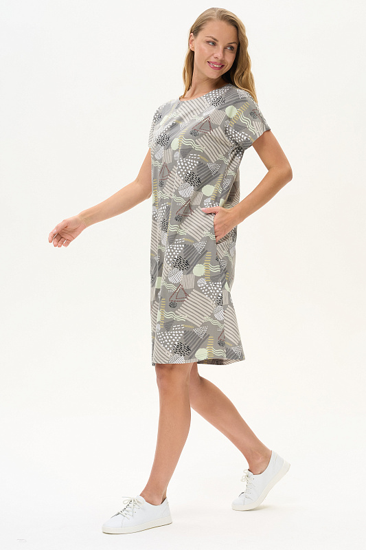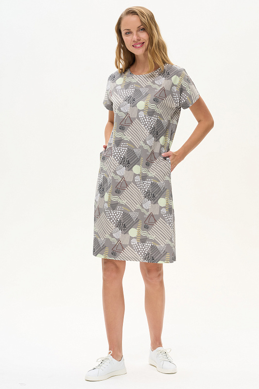 Платье прямого силуэта из кулирки 145 гр. Круглый вырез горловины, спущенная линия плеча, цельнокроеные короткие рукава, в боковых швах карманы, длина ниже колена. Комфортная модель для дома и отдыха, отлично сидит, подходит на любой тип фигуры. Рост модели 175 см