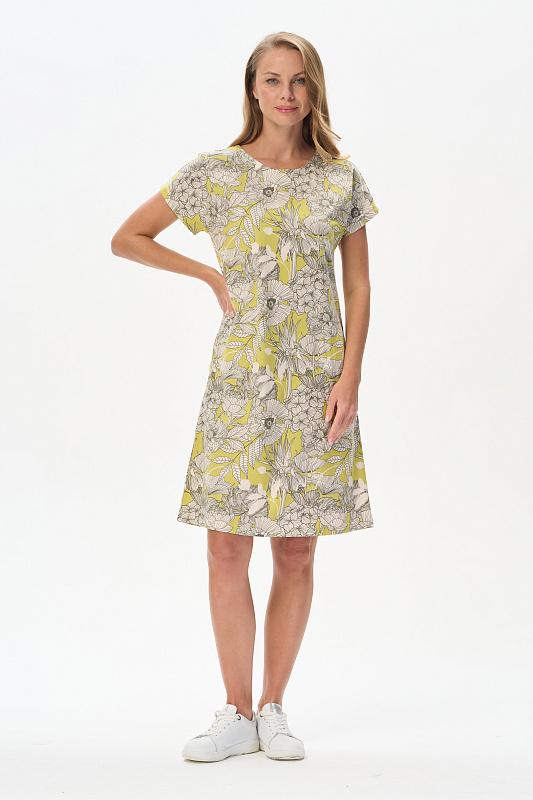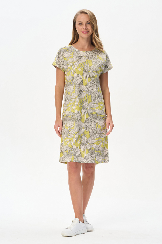 Платье прямого силуэта из кулирки качества ПЕ150 гр. Изящный растительный рисунок в трендовых оттенках. Круглый вырез горловины, спущенная линия плеча, цельнокроеные короткие рукава, в боковых швах карманы, длина ниже колена. Комфортная модель для дома и отдыха, отлично сидит, подходит на любой тип фигуры. Рост модели 175 см