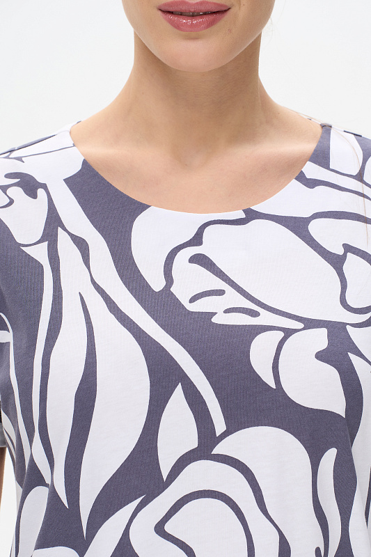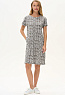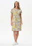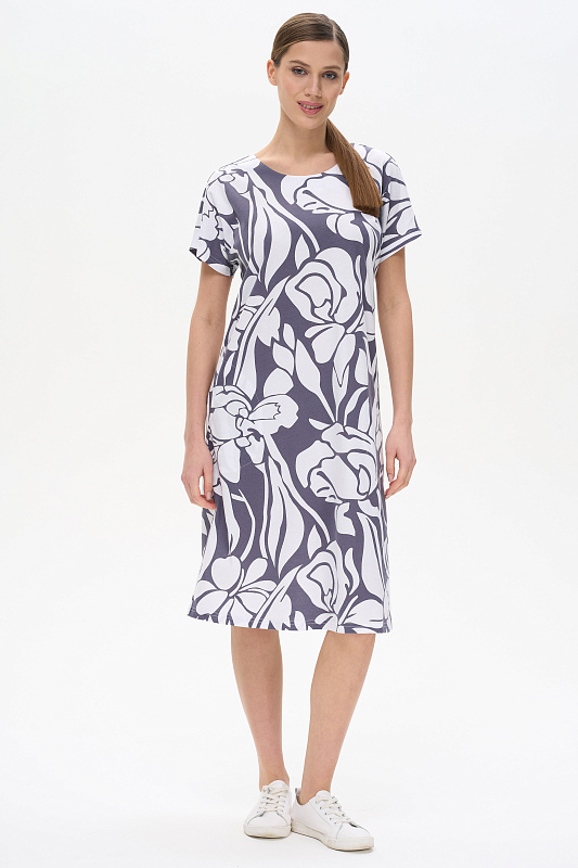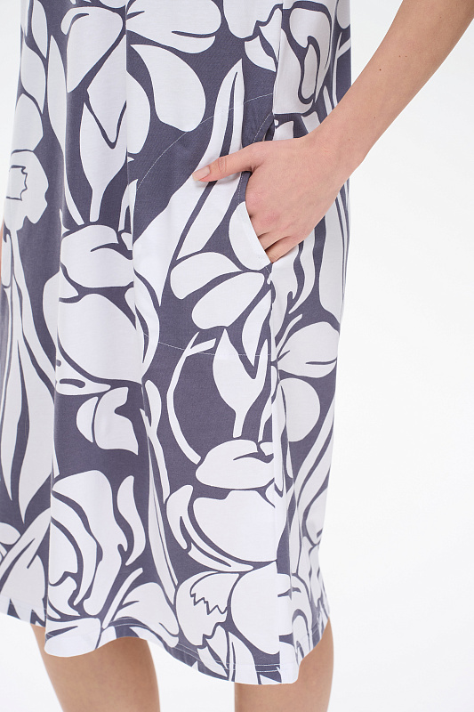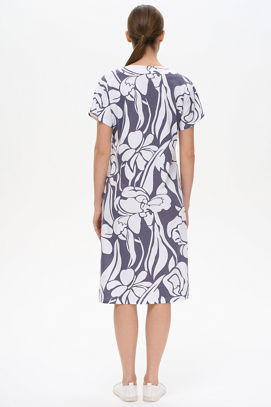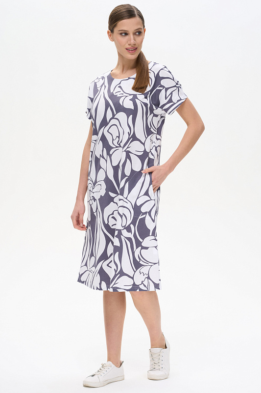 Платье прямого силуэта из хлопкового трикотажного полотна. Круглый вырез горловины, спущенная линия плеча, цельнокроенные короткие рукава, в боковых швах карманы. Длина изделия ниже колена. Рост модели на фото 178см.