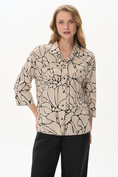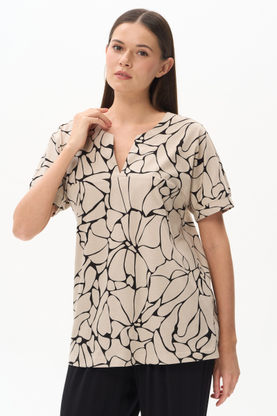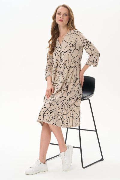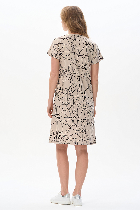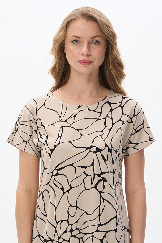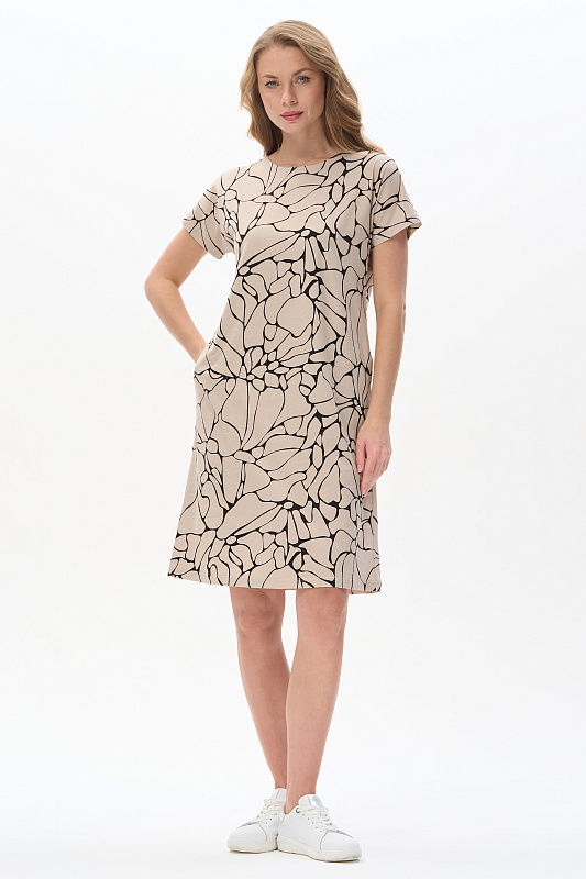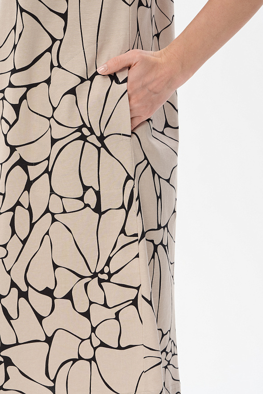 Платье прямого силуэта из кулирки качества ПЕ 150 гр c дизайнерским рисунком - Крупный абстрактный цветок в бежево-чёрных оттенках. Круглый вырез горловины, спущенная линия плеча, цельнокроеные короткие рукава, в боковых швах карманы, длина ниже колена. Эффектная расцветка переводит базовую модель в разряд повседневных и нарядных изделий. Рост модели 175 см.