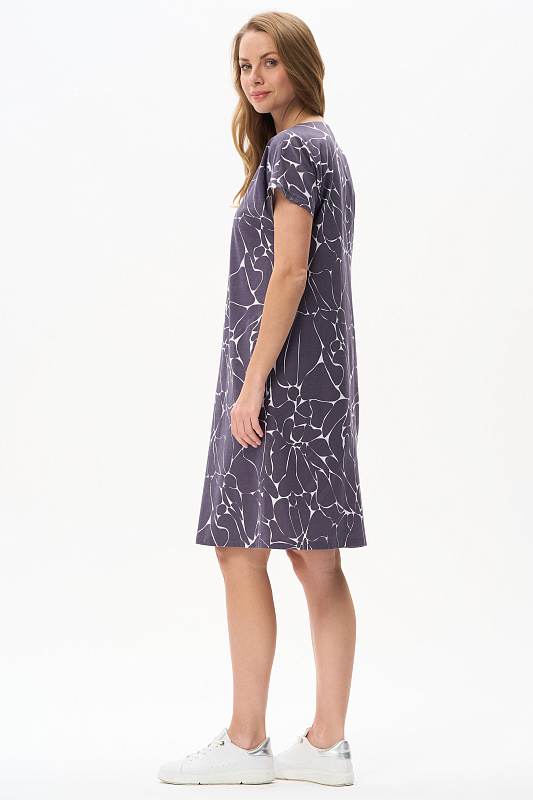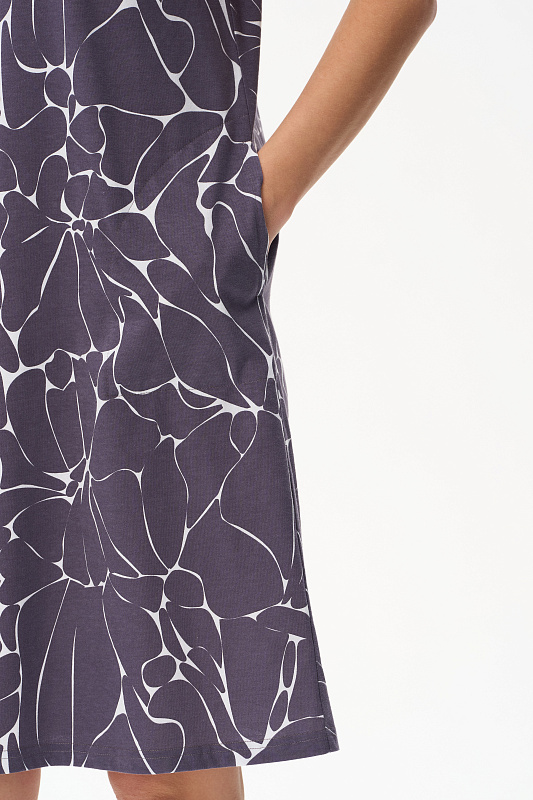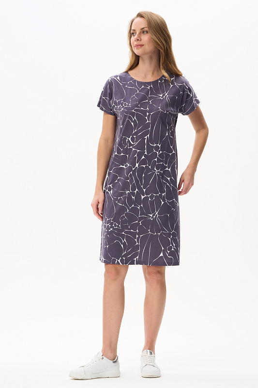 Платье прямого силуэта из кулирки c дизайнерским рисунком. Круглый вырез горловины, спущенная линия плеча, цельнокроеные короткие рукава, в боковых швах карманы, длина ниже колена. Эффектная расцветка переводит базовую модель в разряд повседневных и нарядных изделий. Рост модели 175 см.