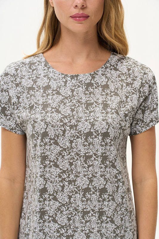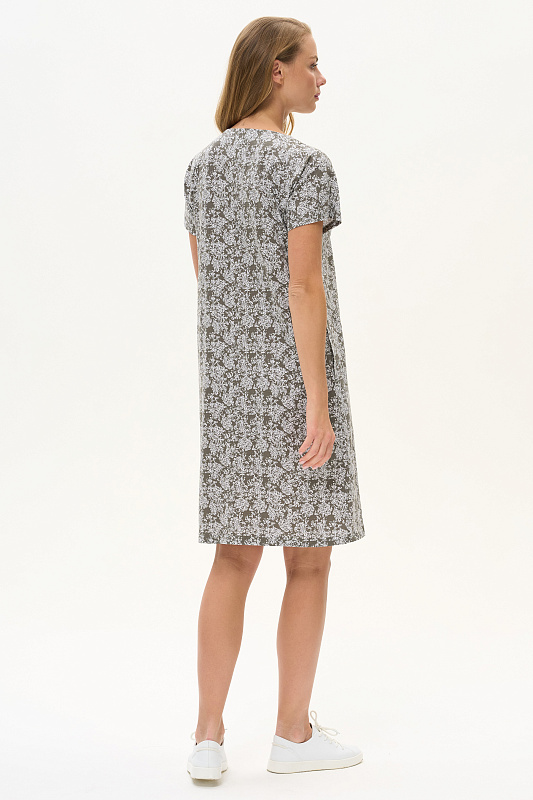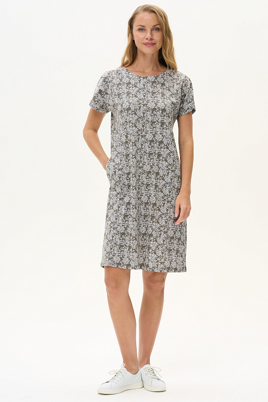 Платье прямого силуэта из кулирки 145 гр. Круглый вырез горловины, спущенная линия плеча, цельнокроенные короткие рукава, в боковых швах карманы, длина ниже колена. Комфортная модель для дома и отдыха, отлично сидит, подходит на любой тип фигуры. Рост модели 175 см