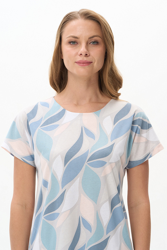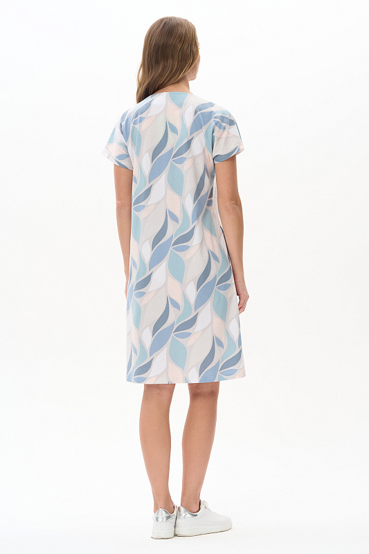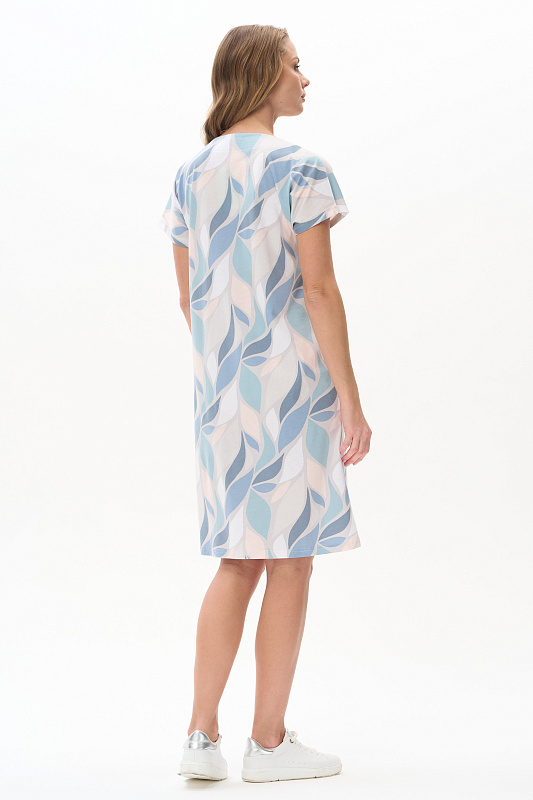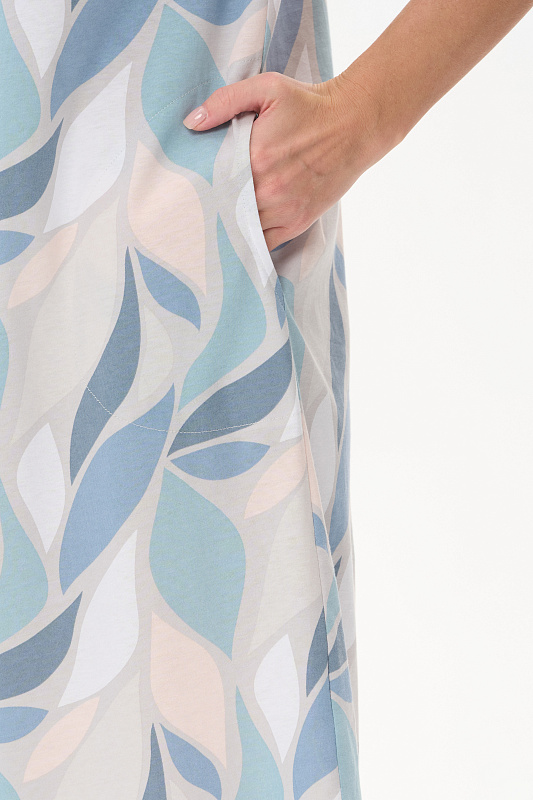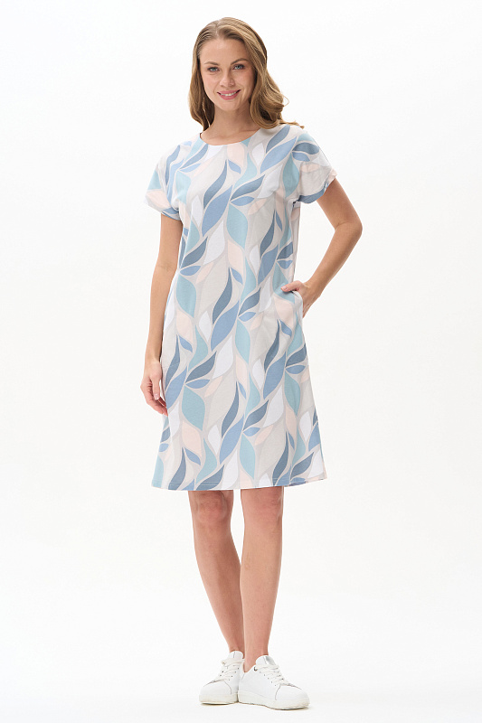Платье прямого силуэта из кулирки c дизайнерским рисунком - растительная абстракция. Круглый вырез горловины, спущенная линия плеча, цельнокроенные короткие рукава, в боковых швах карманы, длина ниже колена. Эффектная расцветка переводит базовую модель в разряд повседневных и нарядных изделий. Рост модели 175 см.