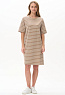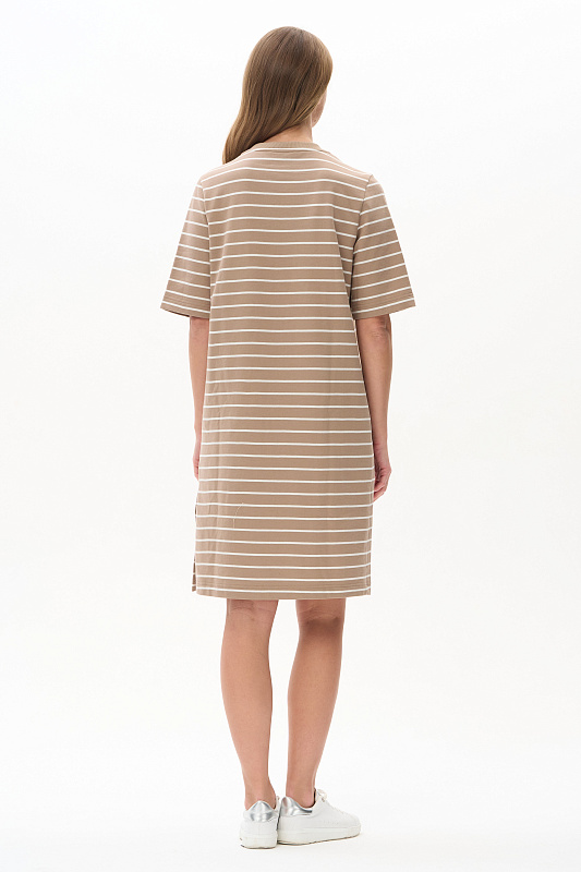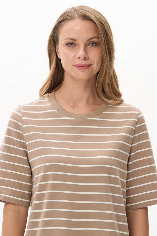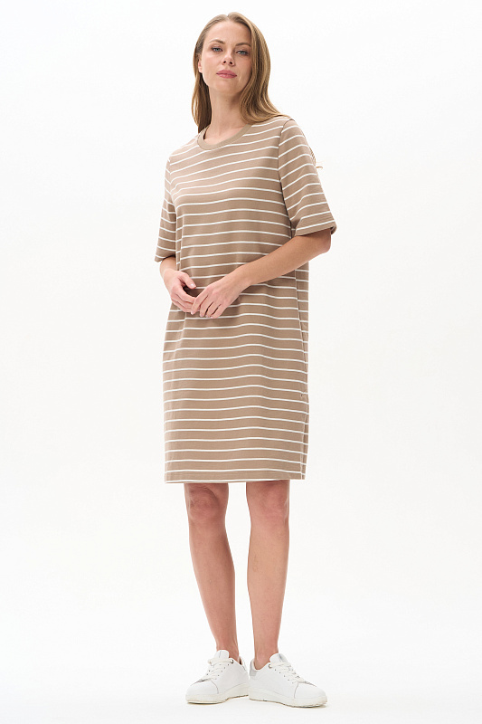 Платье из тонкого футера 200 гр качества ПЕ полоска в оттенках Дюны и Молочный. Модель свободная, прямого силуэта длиной ниже колен, круглый вырез горловины обработан кашкорсе, втачные рукава длиной до локтя, в левом боковом шве - шлица. Комфортное, универсальное платье для города, отдыха и путешествий. Рост модели 175 см.