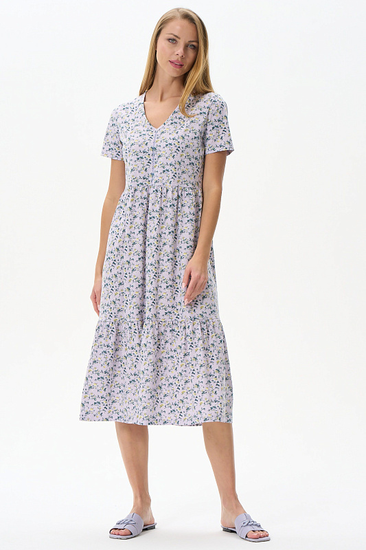 Платье расклешенного силуэта из хлопкового полотна. Вырез горловины V- образной формы, полочка декорирована мережкой. Короткий рукав. Длина ниже колена. Рост модели 177