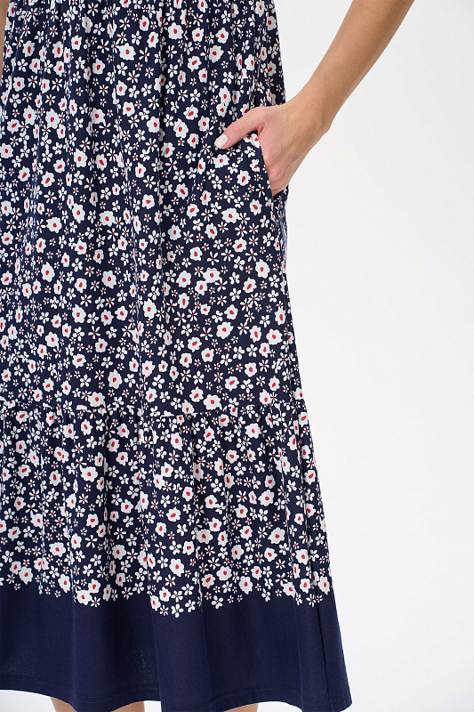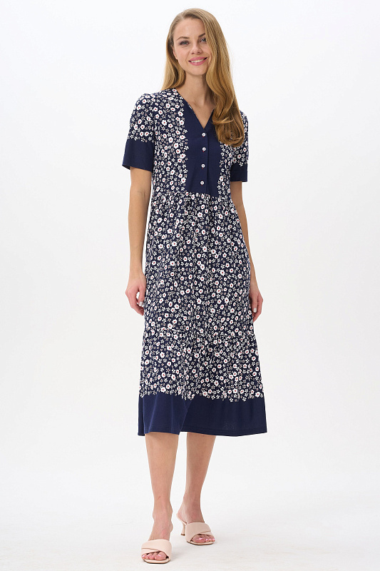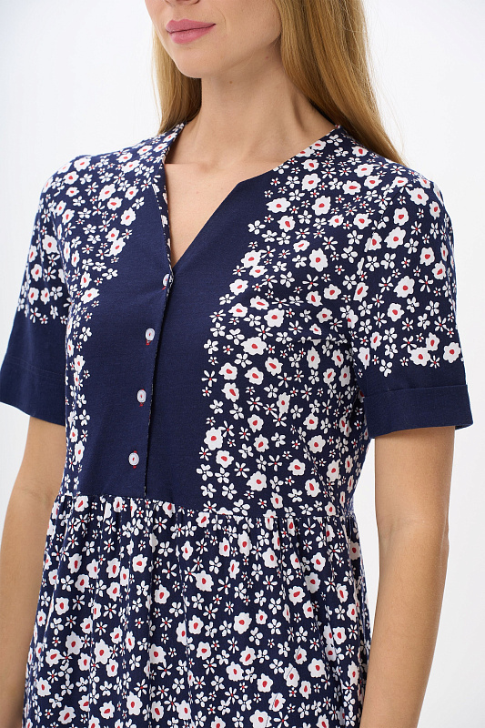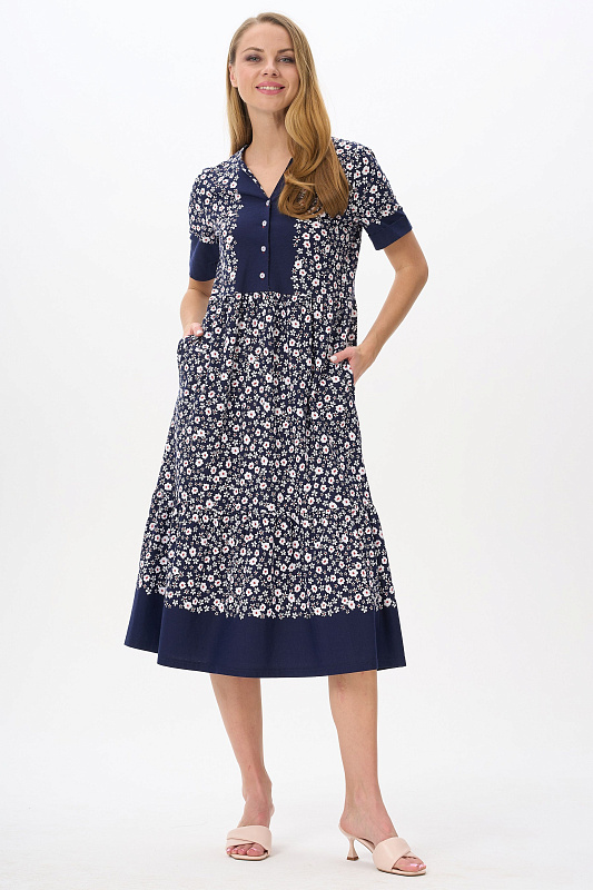 Платье расклешенного силуэта из хлопкового трикотажного полотна. Вырез горловины V- образной формы, застежка на пуговицы, в боковых швах карманы. Короткие втачные рукава. Длина изделия ниже колена. Рост модели 178см.