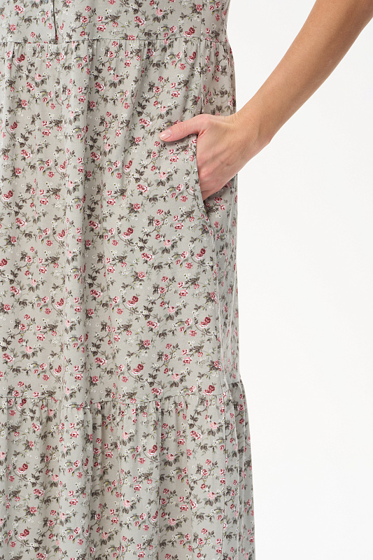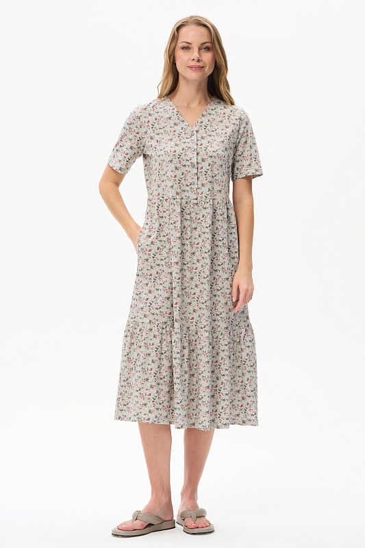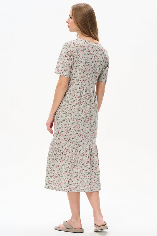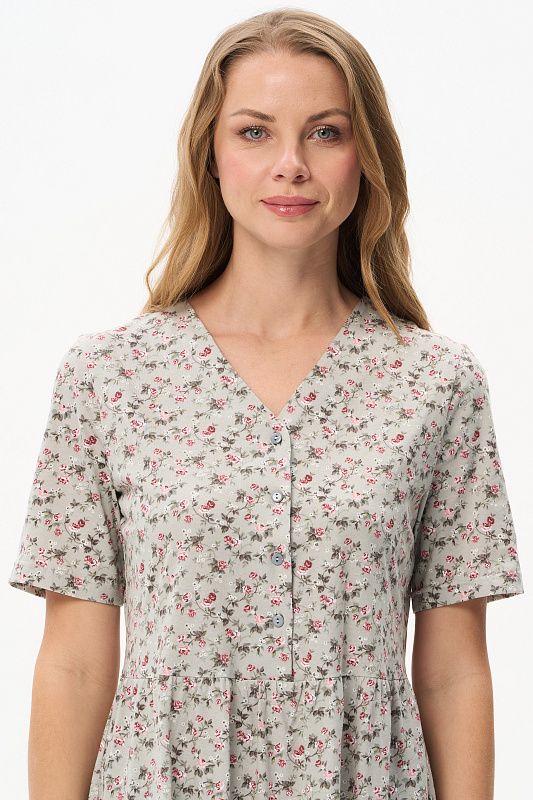 Ярусное платье из кулирки качества ПЕ 145 гр. Нежные розочки на оливковом фоне. Модель свободная, расширенного силуэта, V-образный вырез горловины, застёжка на пуговицы, короткие рукава, в боковых швах карманы, длина до середины икр. Комфортное платье на любой случай, подходит для города, дома и отдыха. Рост модели 175 см