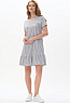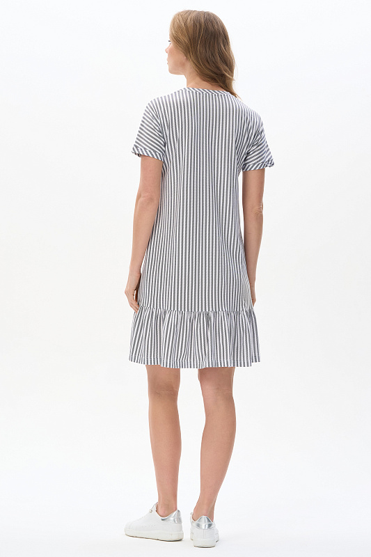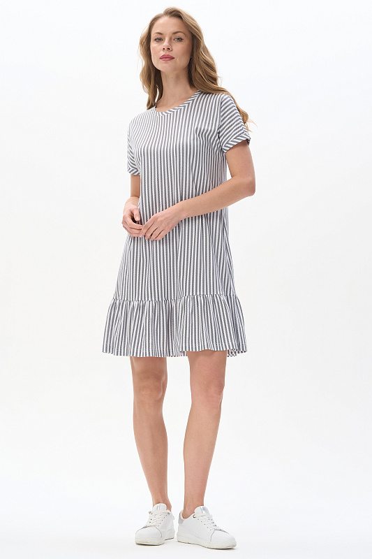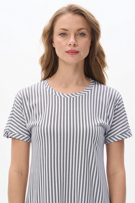 Лёгкое платье из кулирка качества ПЕ 150 гр рисунок - вертикальные диагональные полоски в оттенках Тёмный сапфир и Чистый белый. Круглый вырез горловины, спущенная линия плеча, цельнокроеные короткие рукава, по низу оборка, длина ниже колена. Эффектная полоска добавляет модели динамику и стиль. Идеальная модель для летнего сезона. Рост модели 175 см