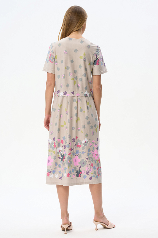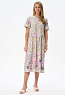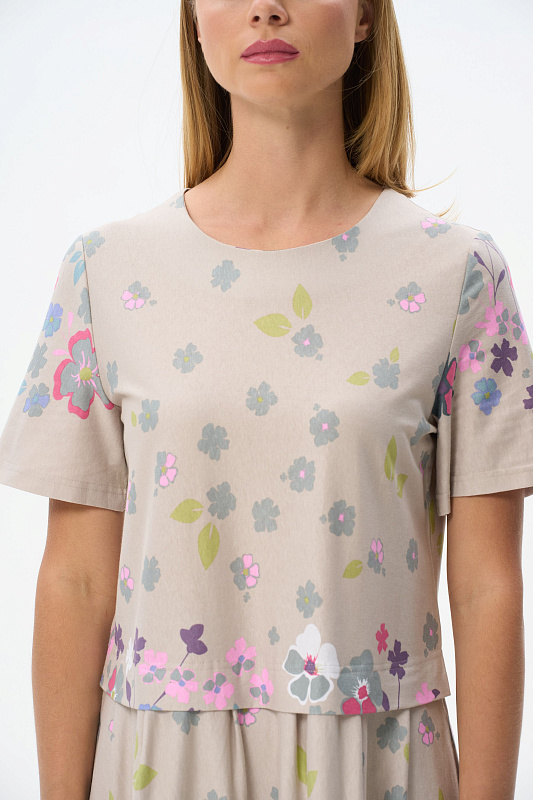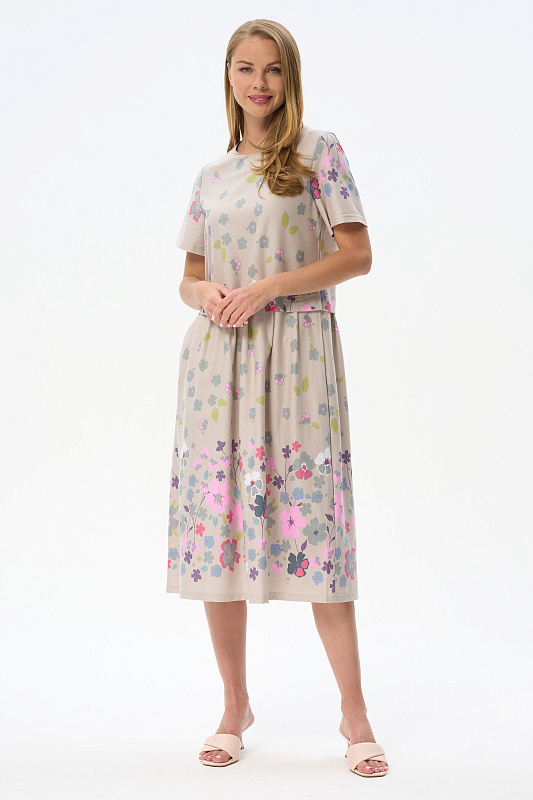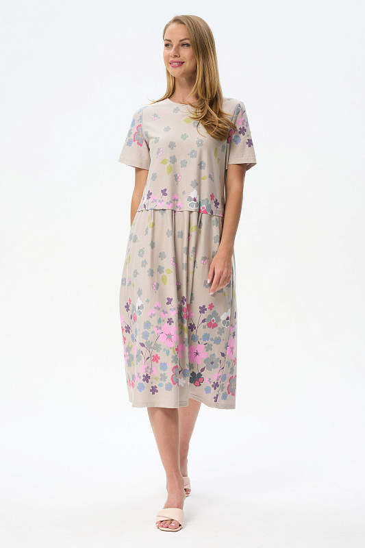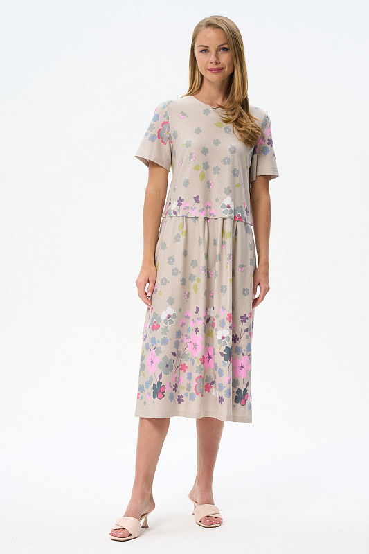Платье свободного силуэта из хлопкового трикотажного полотна с красивым цветочным принтом. Круглый вырез горловины, короткие рукава. Отрезная линия талии оформлена мягкими складками. Длина изделия ниже колена. Рост модели на фото 177см.