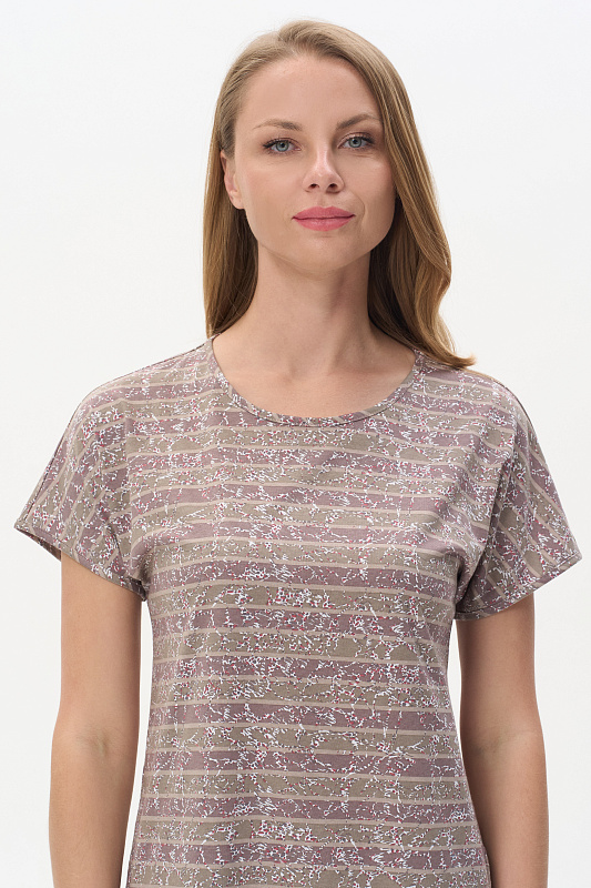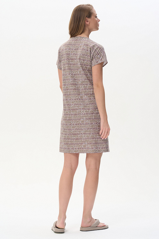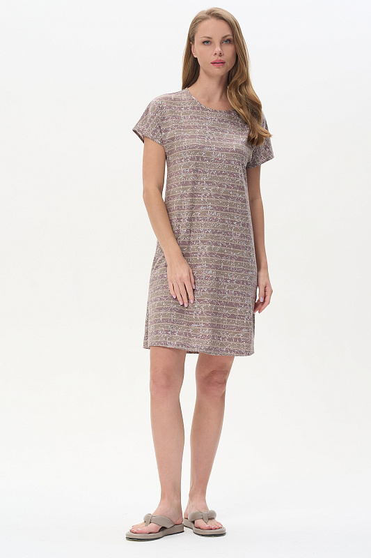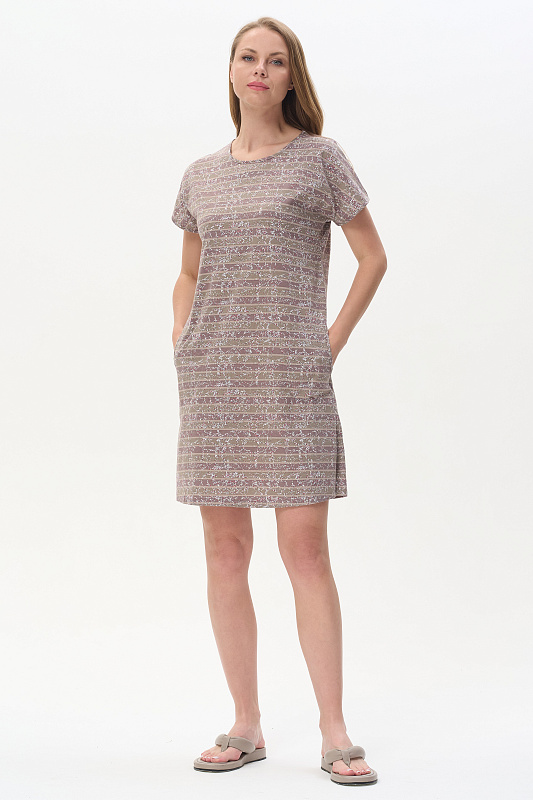Платье прямого силуэта из набивной кулирки качества ПЕ145 гр. Круглый вырез горловины, спущенная линия плеча, цельнокроеные короткие рукава, в боковых швах карманы, длина выше колена, по бокам разрезы. Комфортная модель для дома и отдыха, отлично сидит, подходит на любой тип фигуры. Рост модели 175 см