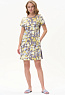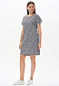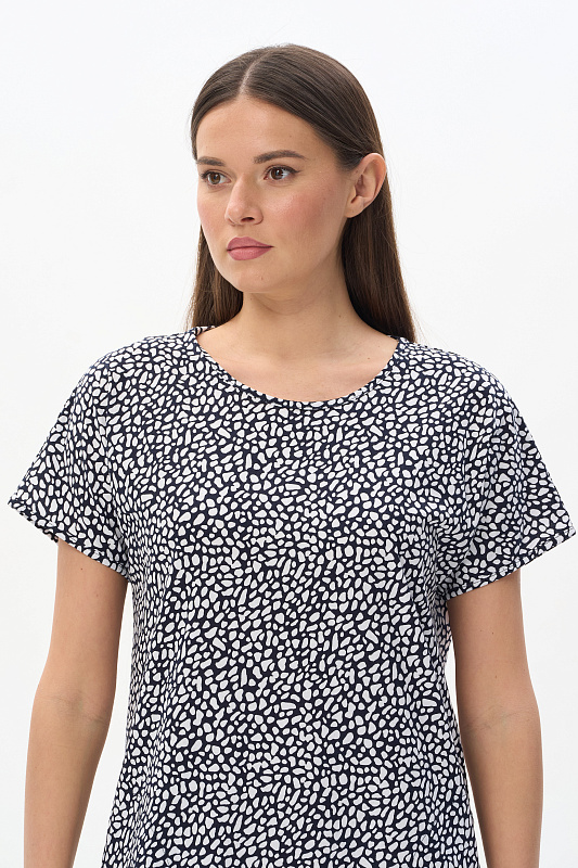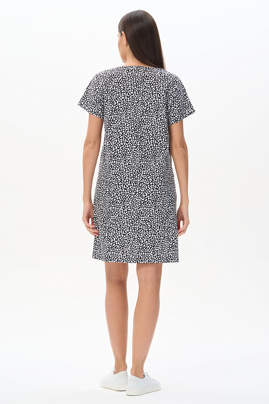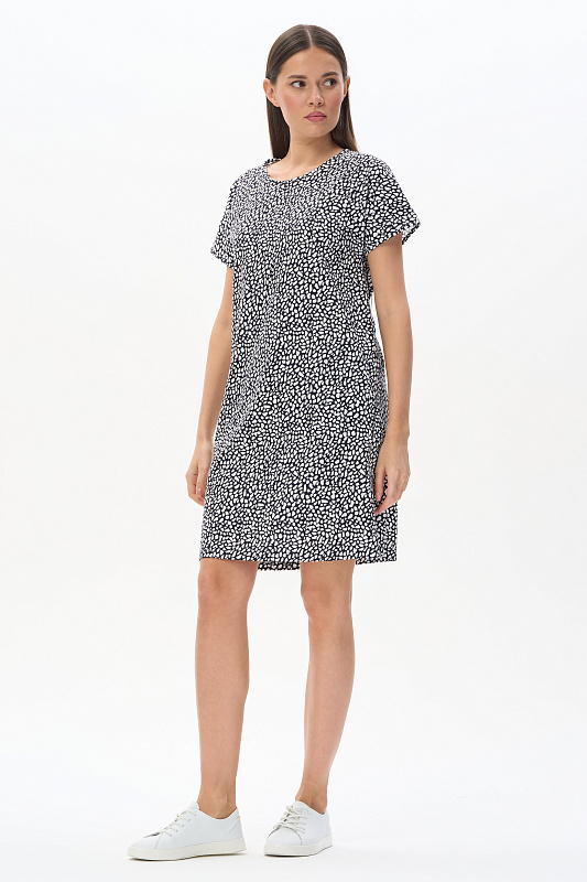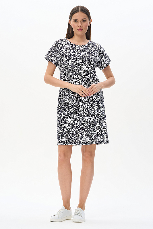 Платье прямого силуэта из набивной кулирки 145 гр. Белая графика на глубоком синем. Круглый вырез горловины, спущенная линия плеча, цельнокроеные короткие рукава, в боковых швах карманы, длина выше колена, по бокам разрезы. Комфортная модель для дома и отдыха, отлично сидит, подходит на любой тип фигуры. Рост модели 175 см.