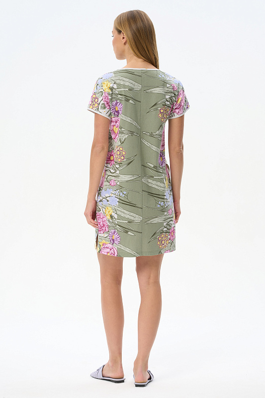 Платье прямого силуэта из хлопкового трикотажного полотена. Круглый вырез горловины, цельнокроеные короткие рукава. В боковых швах карманы и по низу разрезы. Длина изделия выше колена. Рост модели на фото 177см.