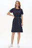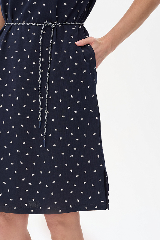 Платье прямого силуэта из пике 190 гр в Глубоком синем оттенке с белым графическим рисунком. Круглый вырез горловины, короткие втачные рукава, в боковых швах карманы. Силуэт платья моделируется с помощью декоративного пояса-шнурка. Длина изделия чуть ниже колена. Комфортное платье подходит для города и отдыха. Рост модели 175 см.