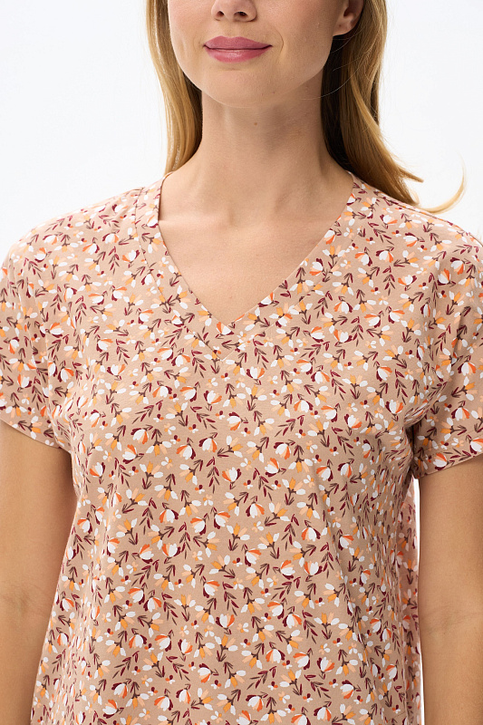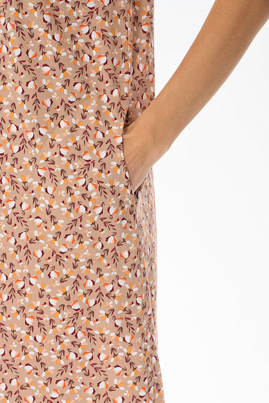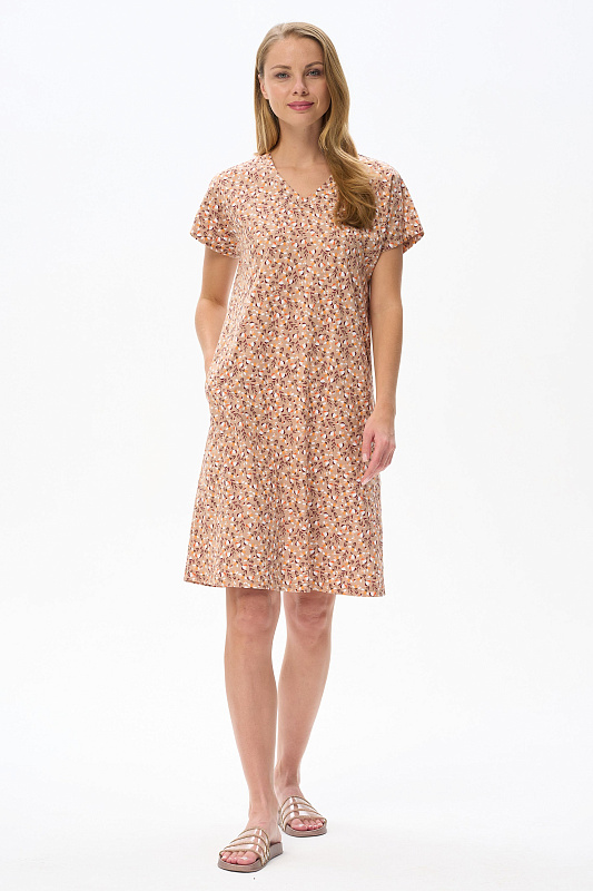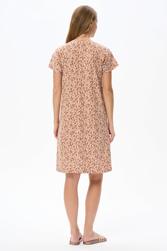 Платье прямого силуэта из хлопкового трикотажного полотна. V-образный вырез горловины, спущенная линия плеча, цельнокроенные короткие рукава, в боковых швах карманы. Длина изделия ниже колена. Рост модели на фото 178см.