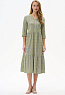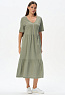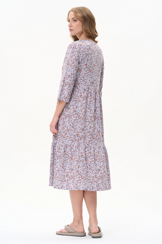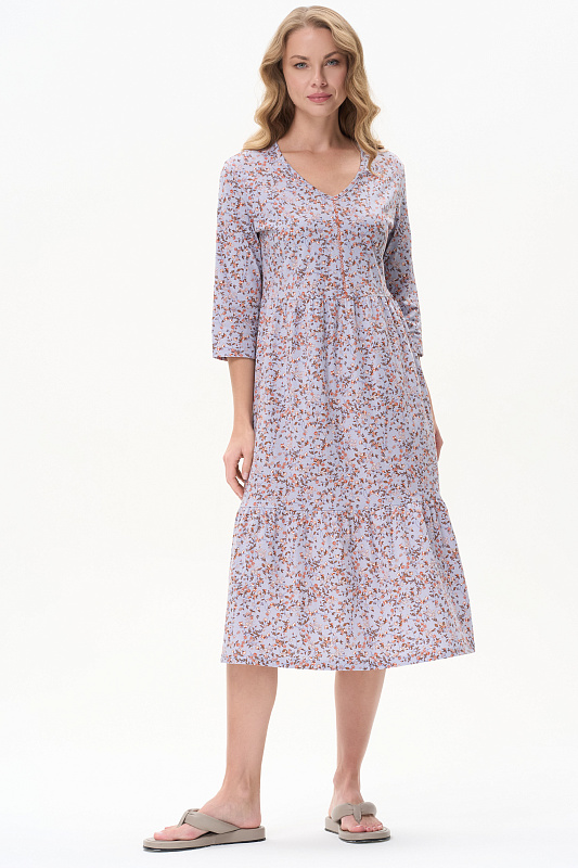 Ярусное платье из кулирки качества ПЕ 145 гр. Модель свободная, расширенного силуэта, V-образный вырез горловины, на полочке отделочная отстрочка - мережка, рукава длиной за локоть, длина до середины икр. Комфортное платье на любой случай, подходит для города, дома и отдыха. Рост модели 175 см