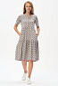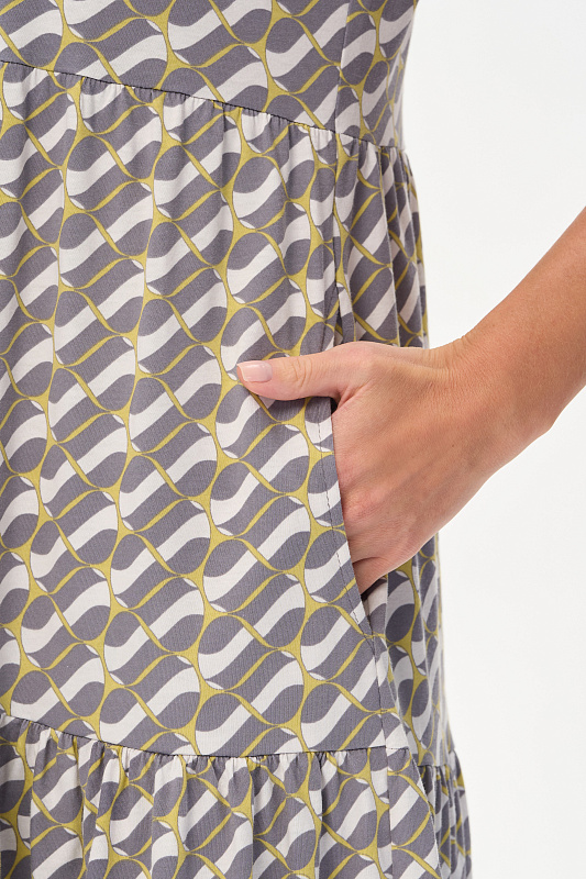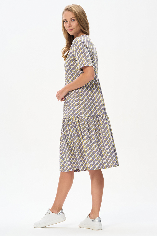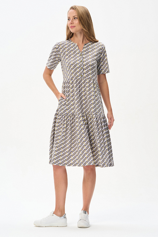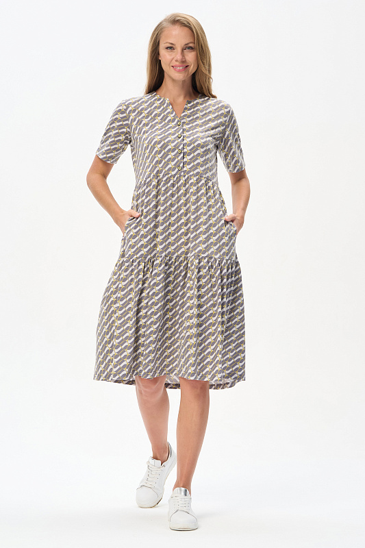 Комфортное ярусное платье из кулирки пенье 150 гр Графический рисунок в стиле Gucci в оттенках коллекции. Круглый вырез горловины, карманы в боковых швах. Модель прекрасно подходит для офиса благодаря рисунку, застежке на эффектные пуговицы и рукава до локтя. Универсальная модель для города и отдыха. Рост модели 175 см.