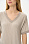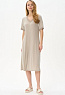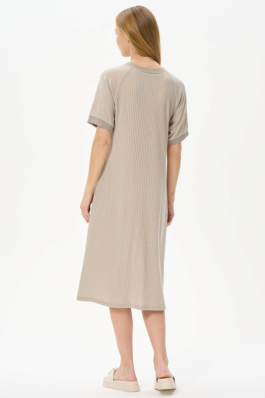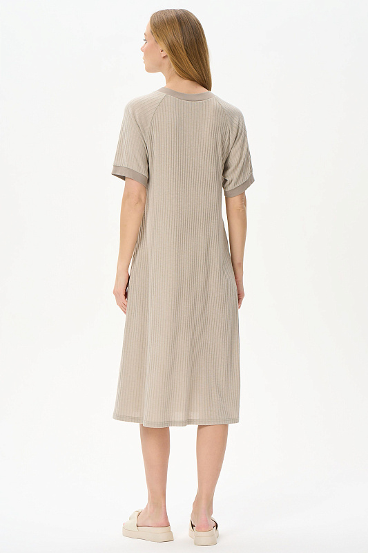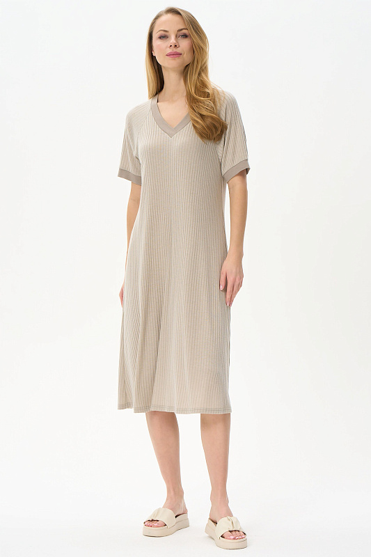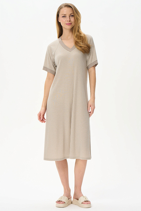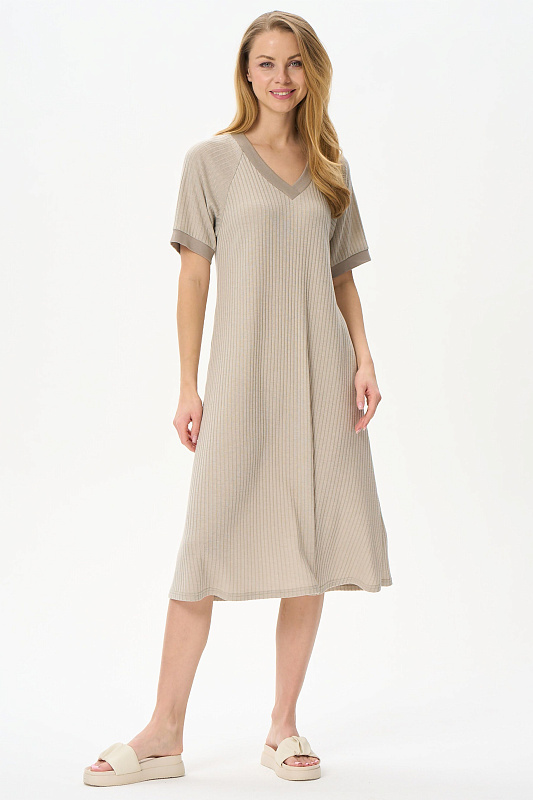 Платье А-образного силуэта из фактурного вискозного полотна. V-образный вырез горловины оформлен планкой. Короткие рукава реглан на манжетах. Планка и манжеты выполнены из хлопкового полотна с модалом - рибаной. Длина изделия ниже колена. Рост модели на фото 178см