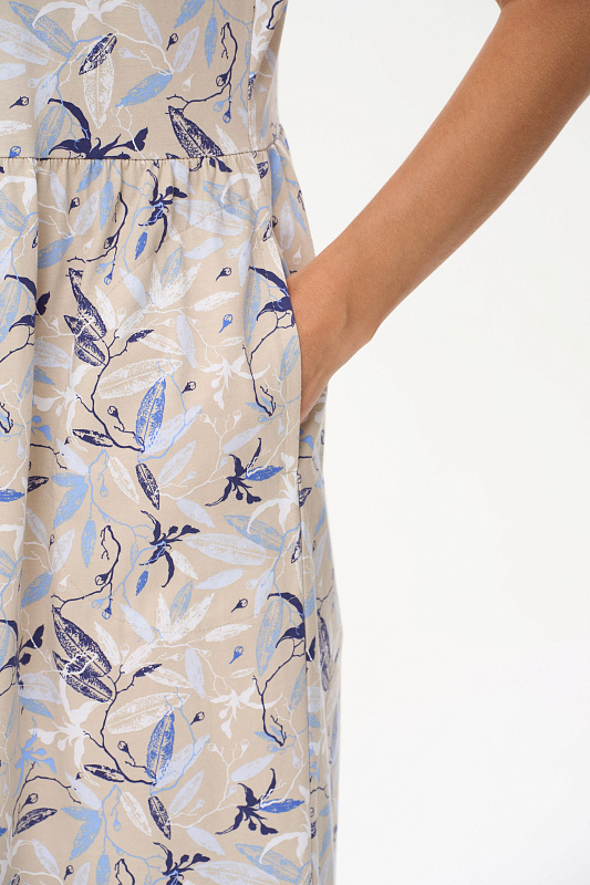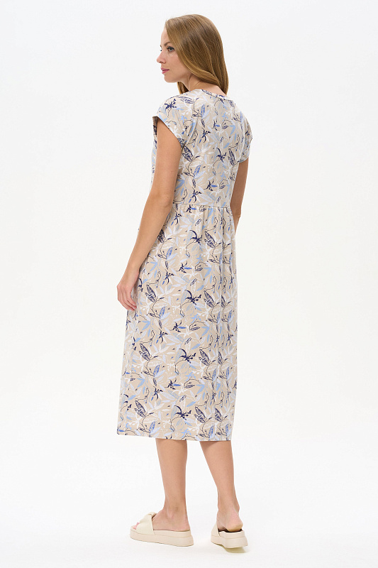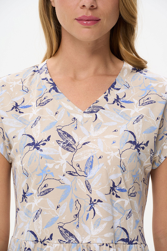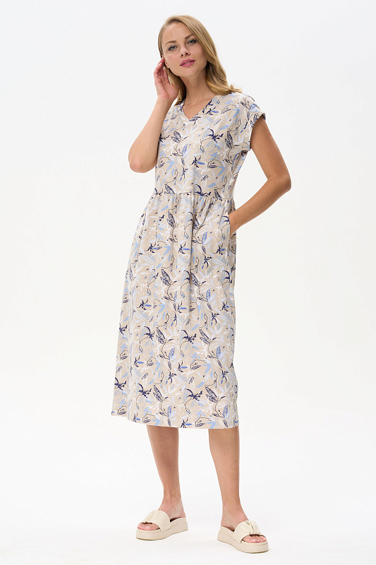 Платье из хлопкового трикотажного полотна. V-образный вырез горловины, цельнокроенные короткие рукава с притачными манжетами. В боковых швах карманы. Рост модели на фото 178см.