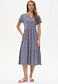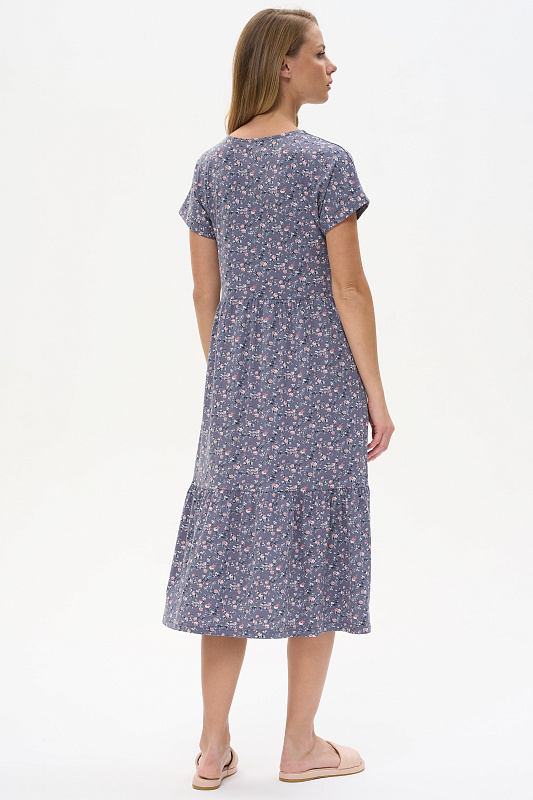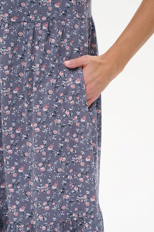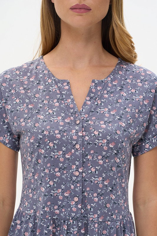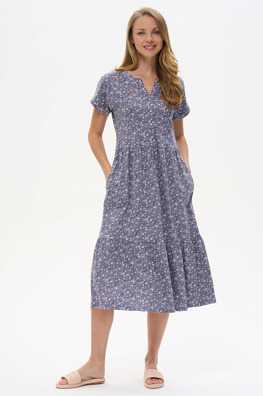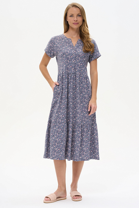 Платье расклешенного силуэта из хлопкового полотна. Круглый вырез горловины, застежка на пуговицы. Цельнокроенные короткие рукава, в боковых швах карманы. Длина ниже колена. Рост модели 175 см.