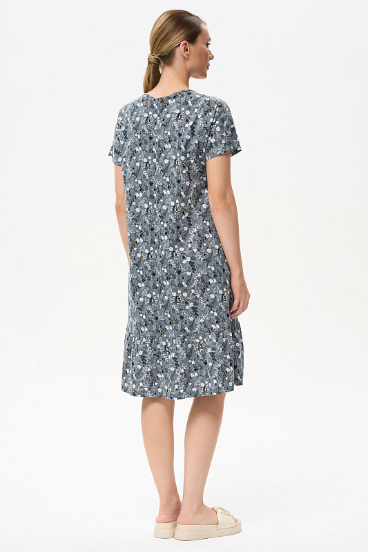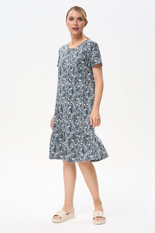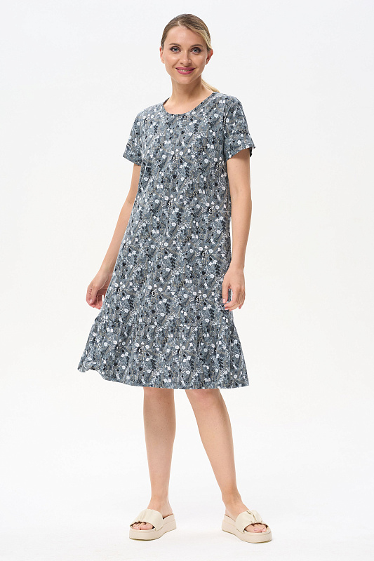 Платье из кулирки качества ПЕ 150 гр. Модель свободная, А -образного силуэта, круглый вырез горловины обработан тонкой бейкой, короткие цельнокроенные рукава, в боковых швах карманы, по низу широкая оборка, длина до колен. Лёгкое, комфортное платье для дома и отдыха. Рост модели 175 см.