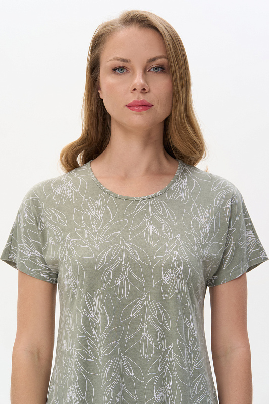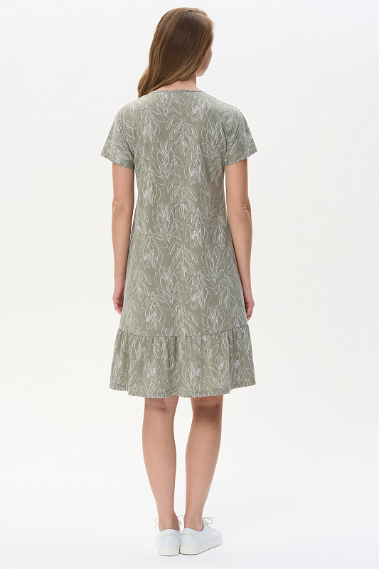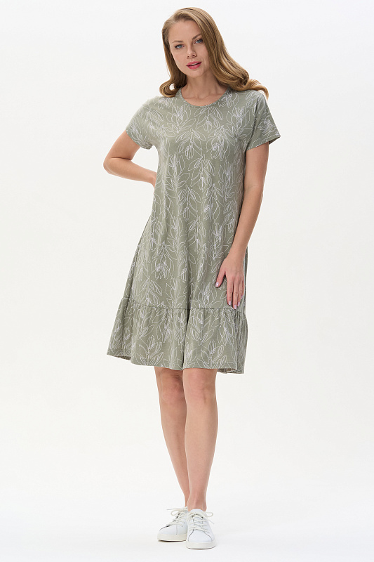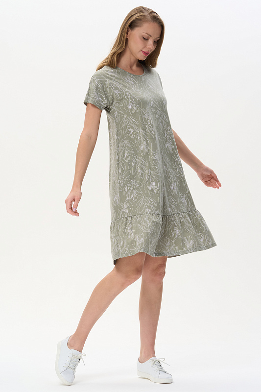 Платье из кулирки качества ПЕ 150 гр. Растительная графика на оливковом фоне. Модель свободная, А-образного силуэта, круглый вырез горловины обработан тонкой бейкой, короткие цельнокроенные рукава, в боковых швах карманы, по низу широкая оборка, длина до колен. Лёгкое, комфортное платье для дома и отдыха. Рост модели 175 см.