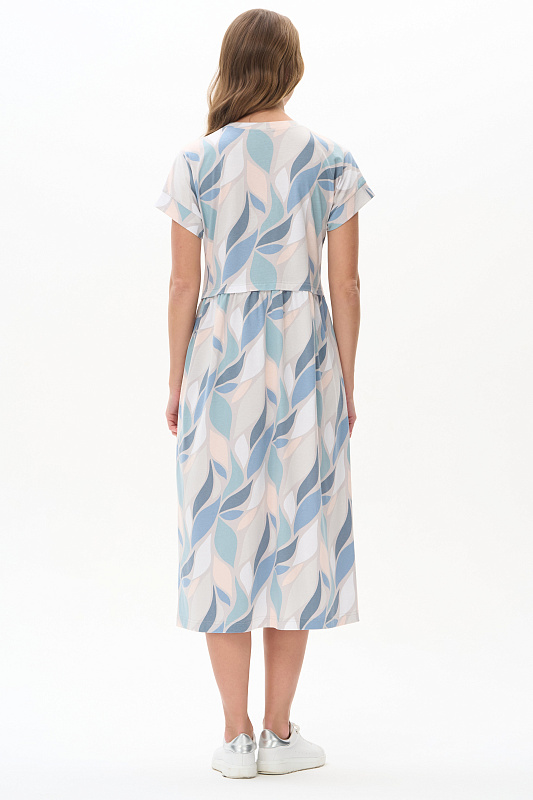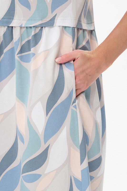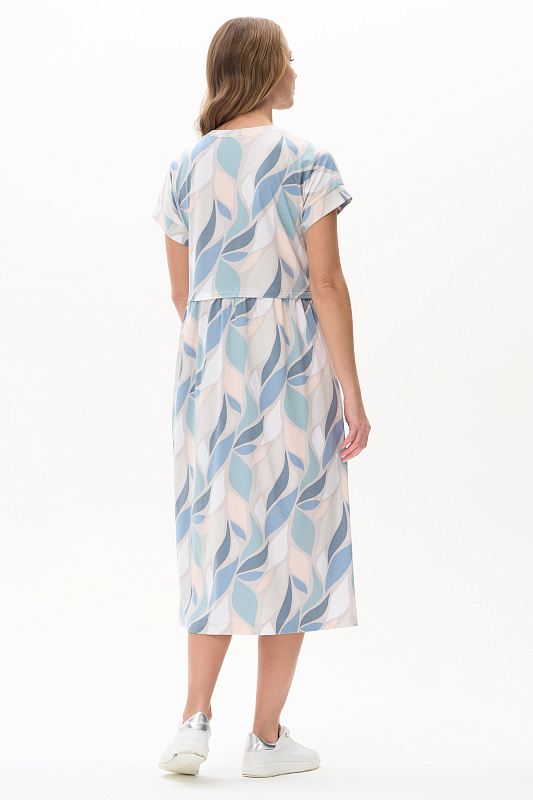 Платье трапецевидного силуэта из кулирки c дизайнерским рисунком - растительная абстракция. Подрез выше линии талии и V-образный вырез - конструктивные особенности этой модели. Спущенная линия плеча, цельнокроенные короткие рукава, в боковых швах карманы. Эффектная расцветка переводит платье в разряд повседневных и нарядных изделий. Рост модели 175 см