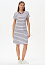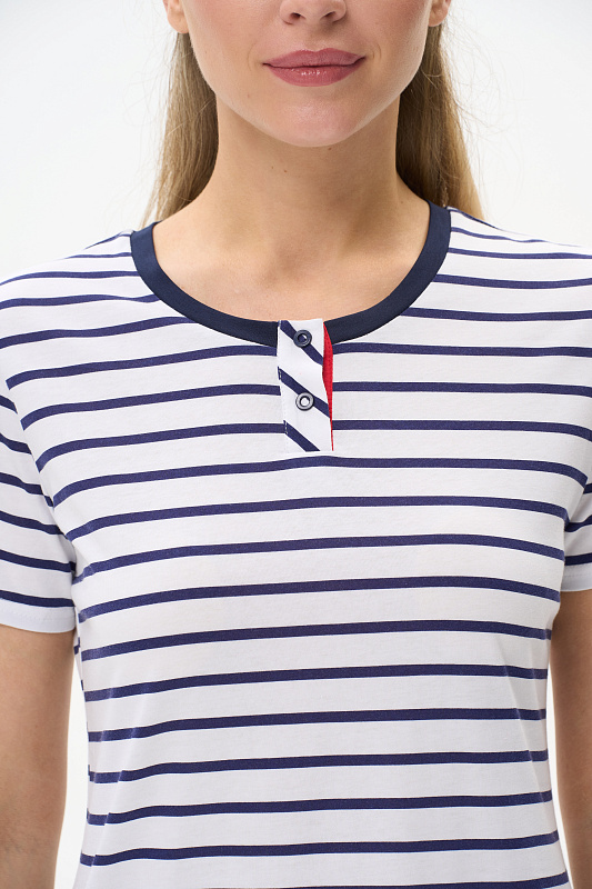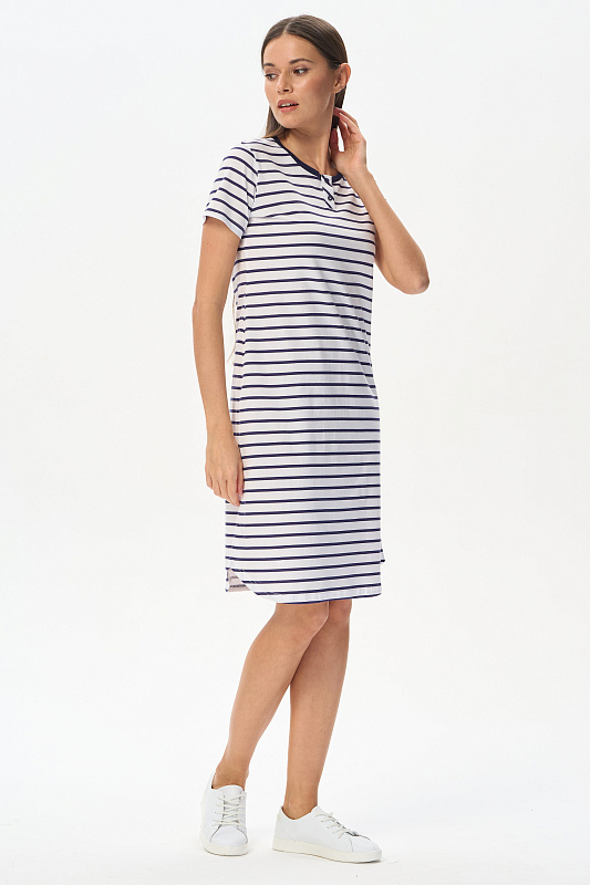Платье прямого силуэта из кулирки 150 гр. В сине-белую полоску. Круглый вырез горловины, изящная планка с контрастной отделкой и с застёжкой на маленькие кнопки, втачные короткие рукава Длина ниже колена, низ фигурный. Эффектная полоска идеальна для жаркого лета, и актуальна в любой сезон. Рост модели 175 см.