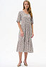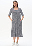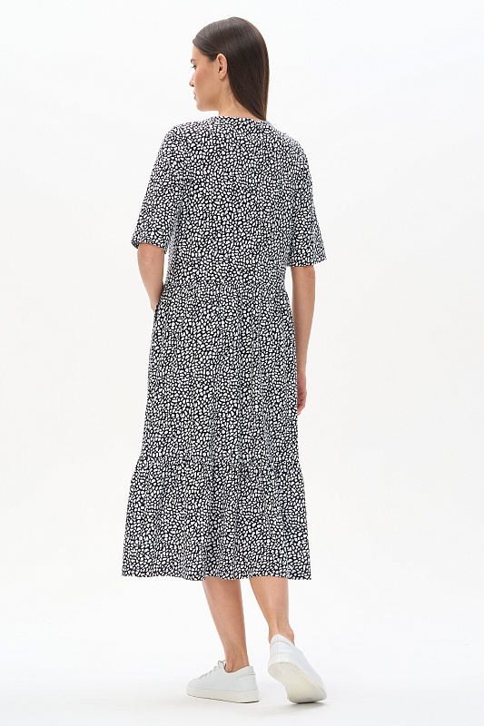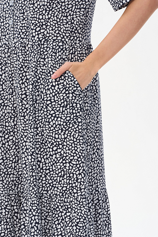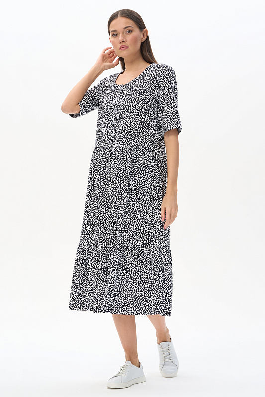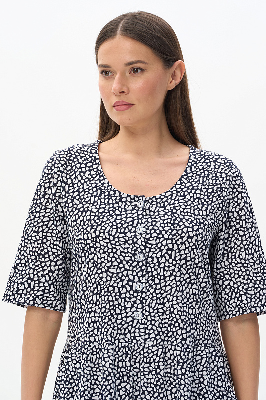 Ярусное платье из кулирки качества ПЕ 145 гр. Белая графика на глубоком синем. Модель свободная, расширенного силуэта, круглый углублённый вырез горловины, полочка с застёжкой на пуговицы, рукава до локтя с широкой подгибкой для регулирования длины, удобные карманы, длина до середины икр. Комфортное платье на любой случай, подходит для города, дома и отдыха. Рост модели 175 см