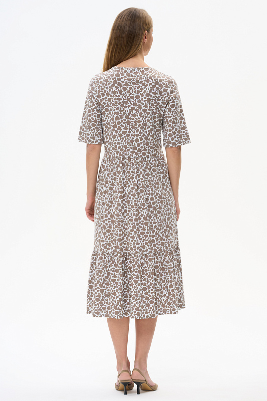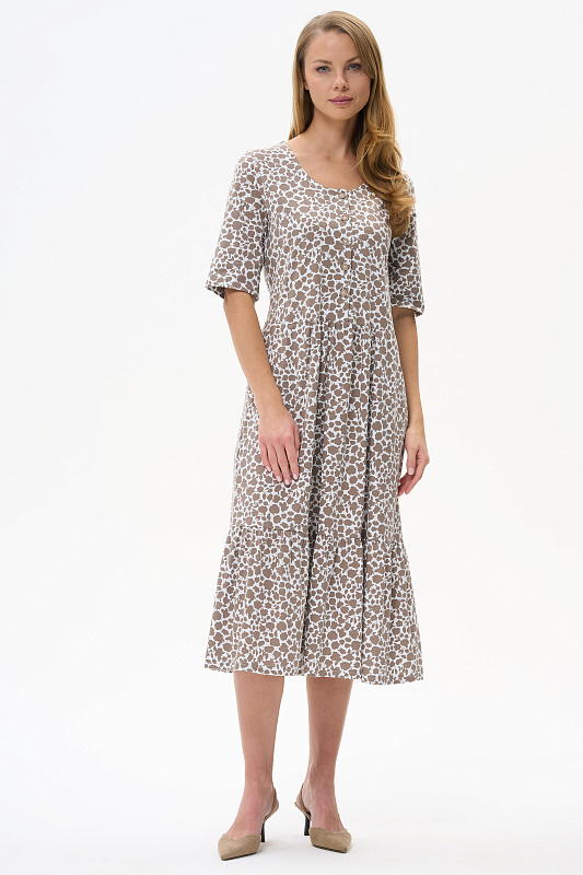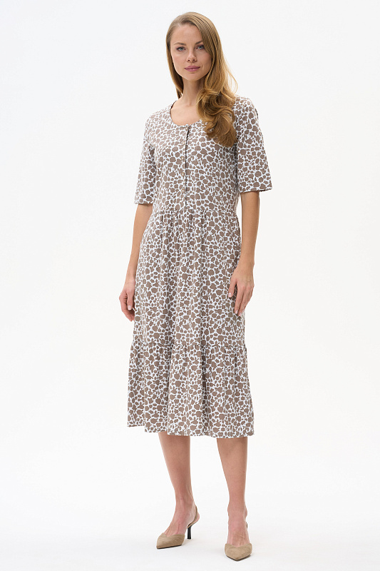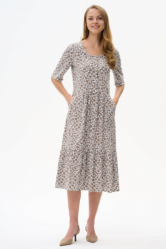 Ярусное платье из кулирки качества ПЕ 145 гр. Белая графика на бежевом. Модель свободная, расширенного силуэта, круглый углублённый вырез горловины, полочка с застёжкой на пуговицы, рукава до локтя с широкой подгибкой для регулирования длины, удобные карманы, длина до середины икр. Комфортное платье на любой случай, подходит для города, дома и отдыха. Рост модели 175 см