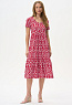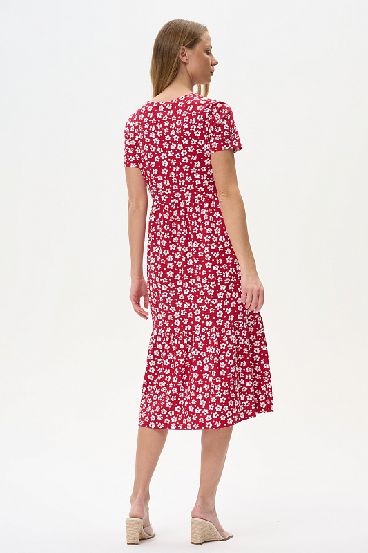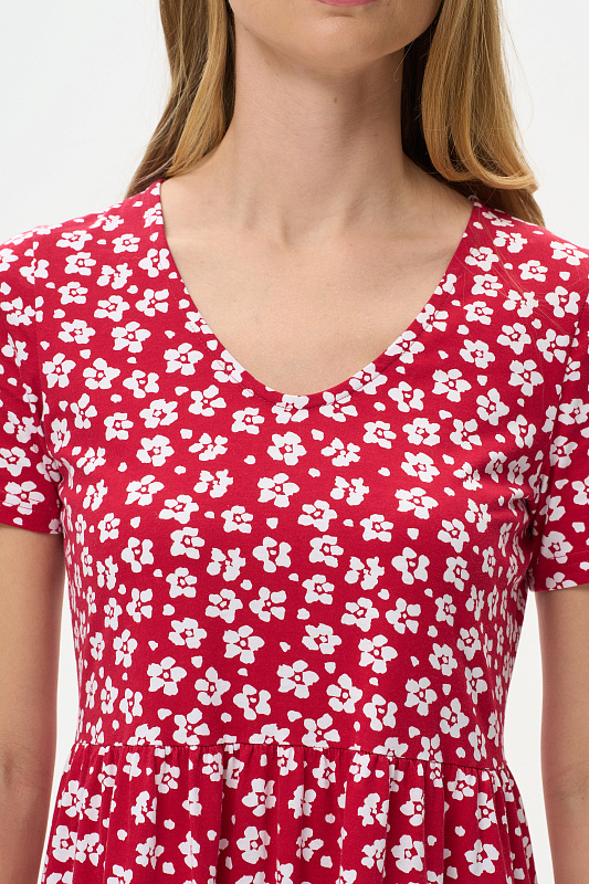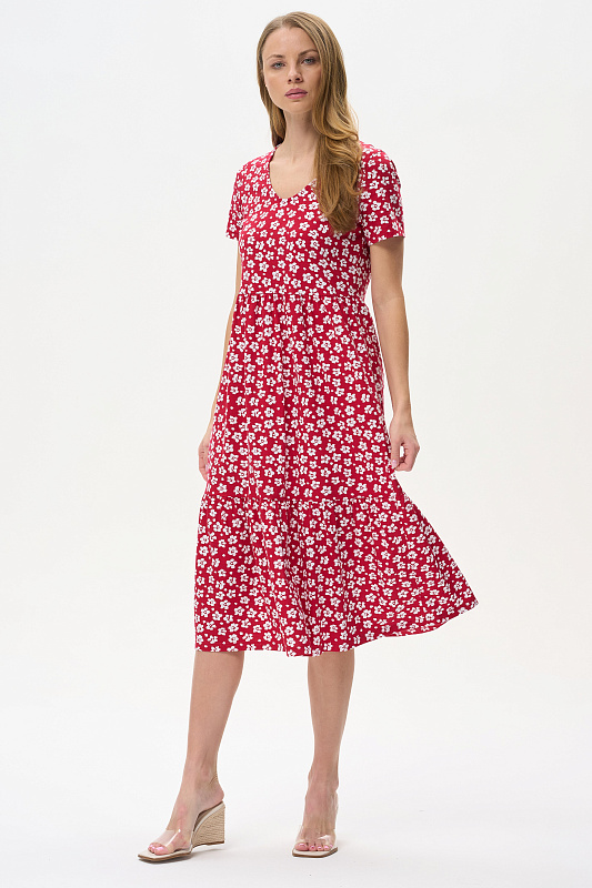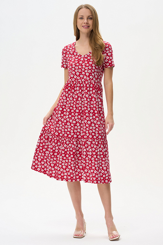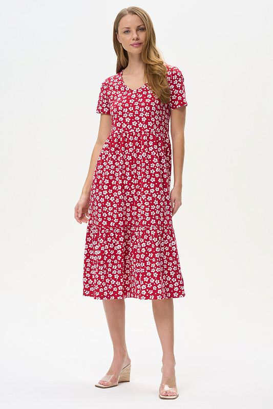Ярусное платье из кулирки качества ПЕ 150 гр. Модель свободная, силуэт лёгкая трапеция, V-образный вырез горловины, короткие рукава, длина до середины икр. Комфортное платье на любой случай, подходит для города, дома и отдыха. В красно-белом дизайне смотрится особенно ярко и нарядно. Рост модели 175 см.