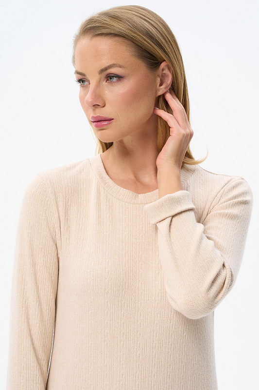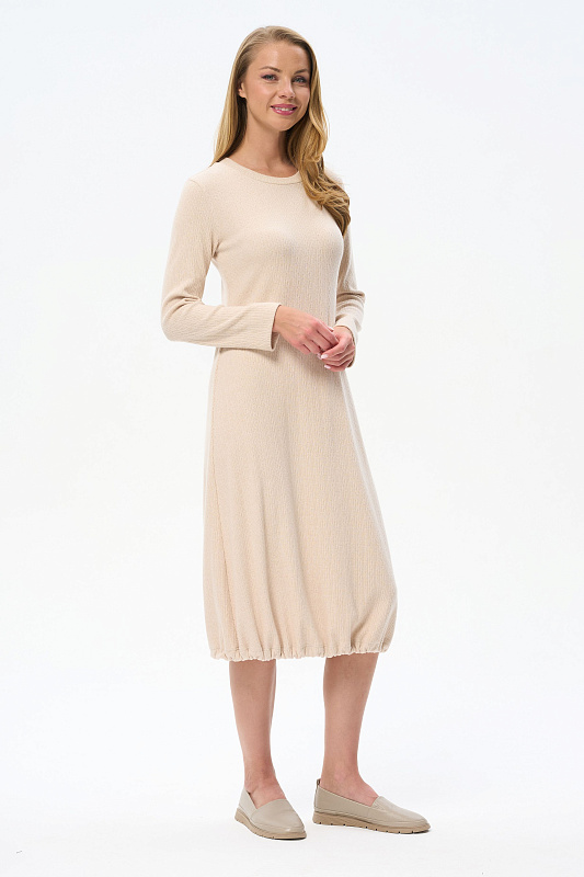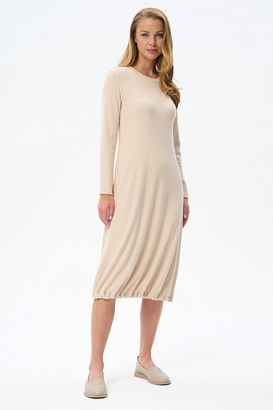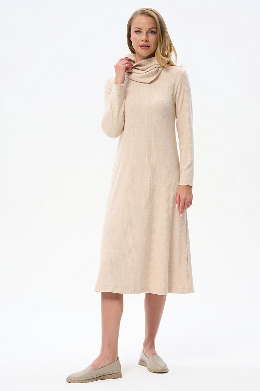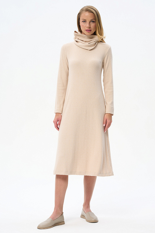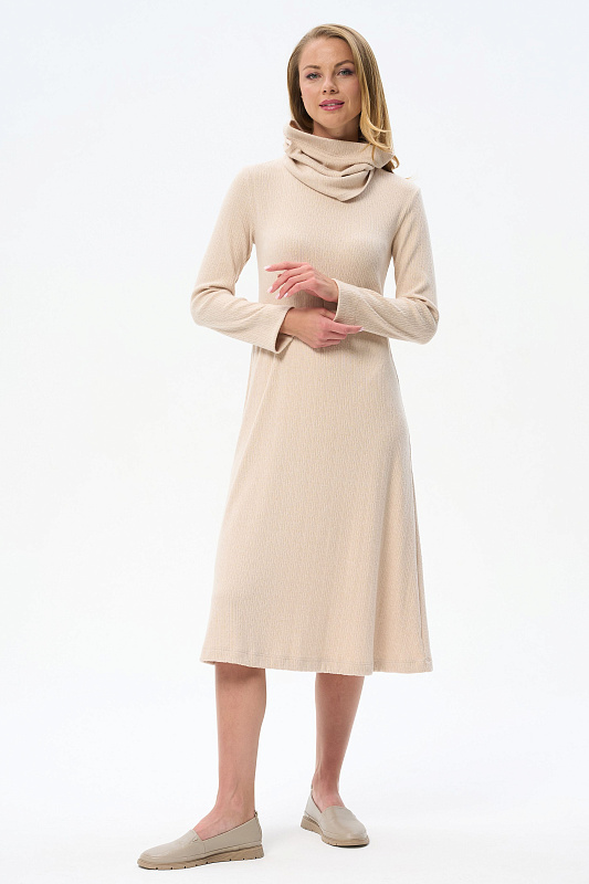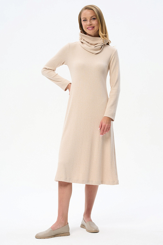 Платье полуприлегающего силуэта, выполнено из фактурного вискозного трикотажного полотна с эластаном. Круглый вырез горловины, длинные втачные рукава. Образ дополняет съемный воротник- гольф. Расширенный к низу силуэт можно поменять на овальный при помощи эластичной кулиски по низу платья. Рост модели на фото 178 см.
