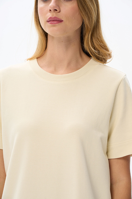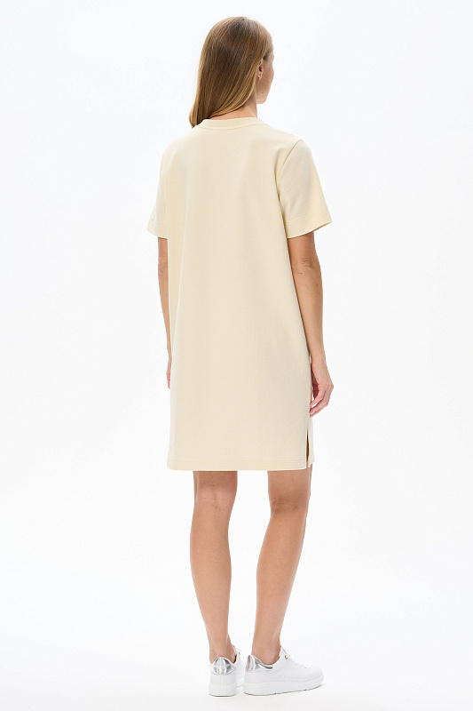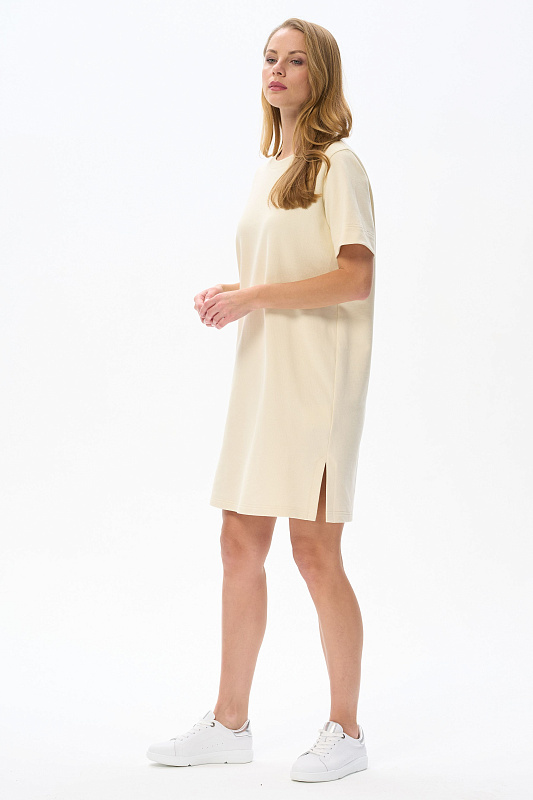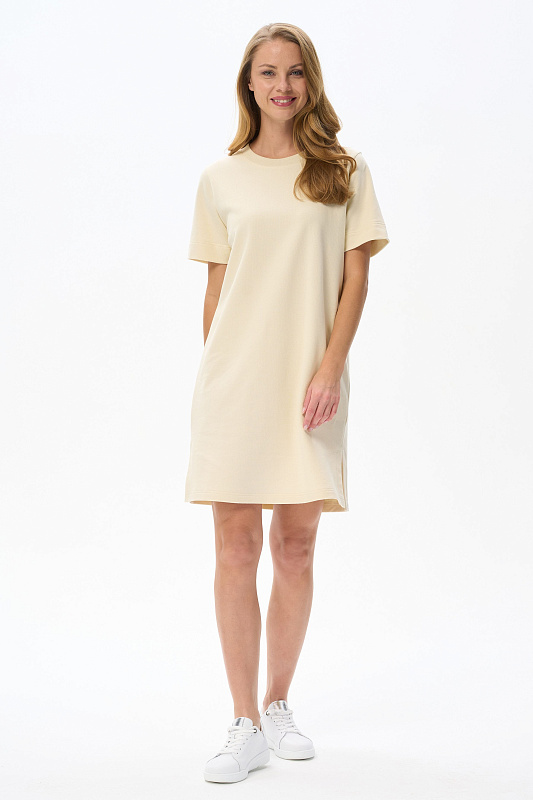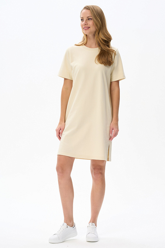 Платье прямого силуэта из хлопкового трикотажного полотна - пике, качества пенье. Круглый вырез горловины обработан хлопковым полотном кашкорсе, втачные короткие рукава. По низу изделия в боковом шве разрез. Рост модели 175 см.