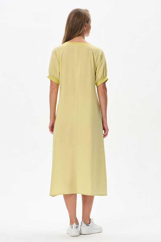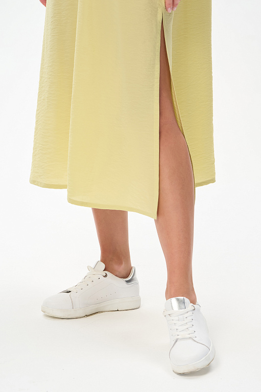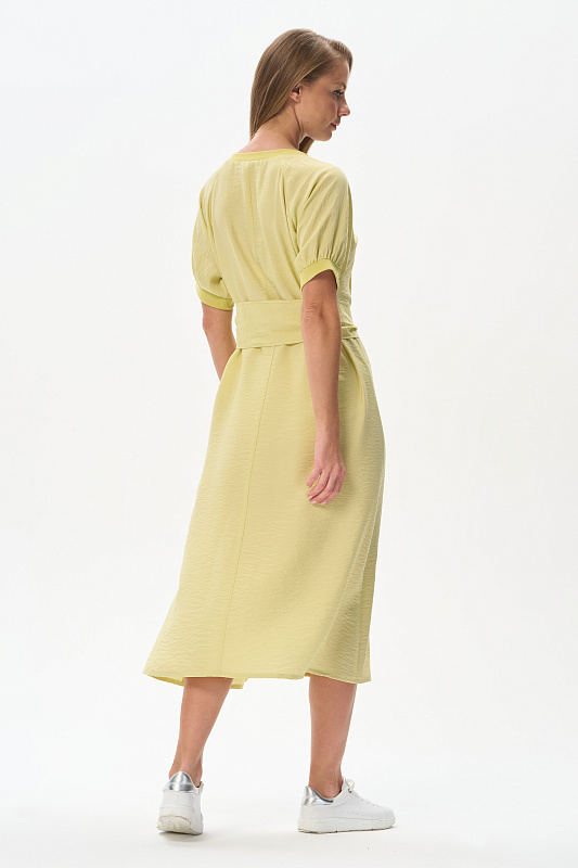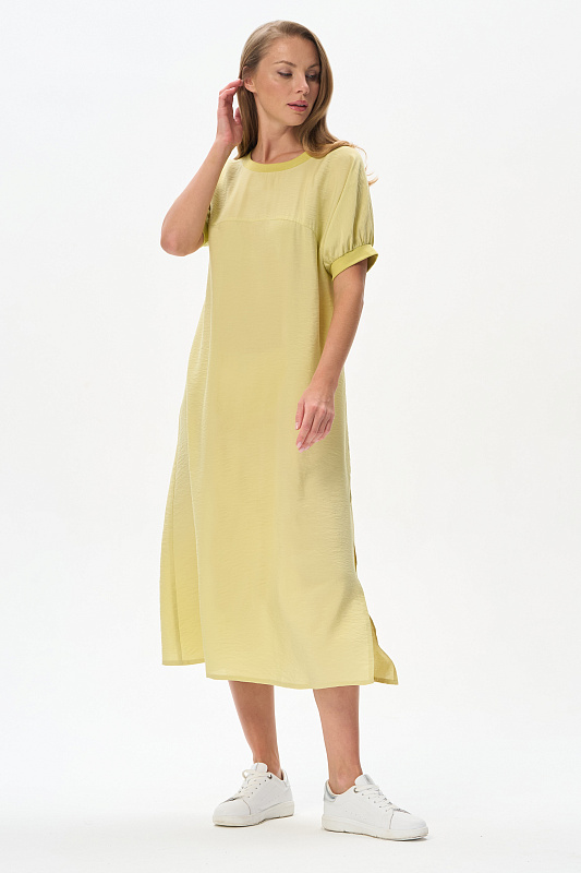 Платье из лёгкой плательной ткани 120 гр в трендовом оттенке. Модель силуэта трапеция, дополнена поясом, с помощью которого можно менять силуэт. Круглый вырез горловины и спущенные рукава обработаны мягким кашкорсе. Платье ниже середины икр, с высоким разрезом в боковом шве. Лёгкая, свободная, комфортная модель для летних образов. Рост модели 175 см