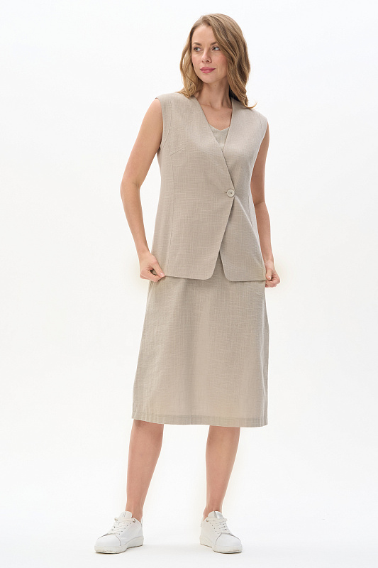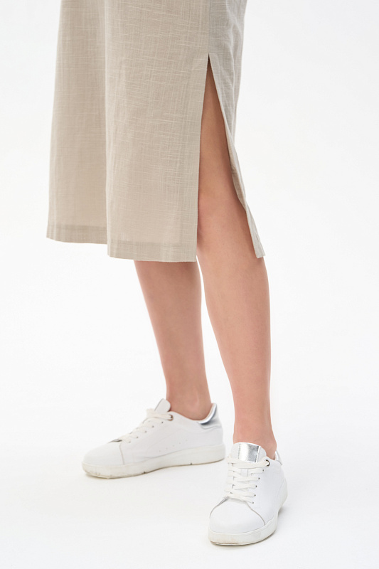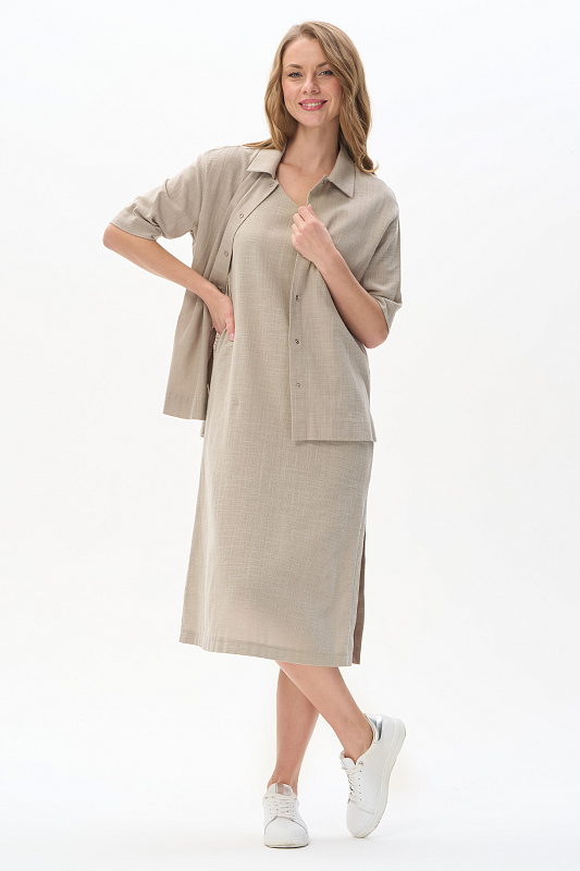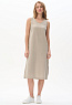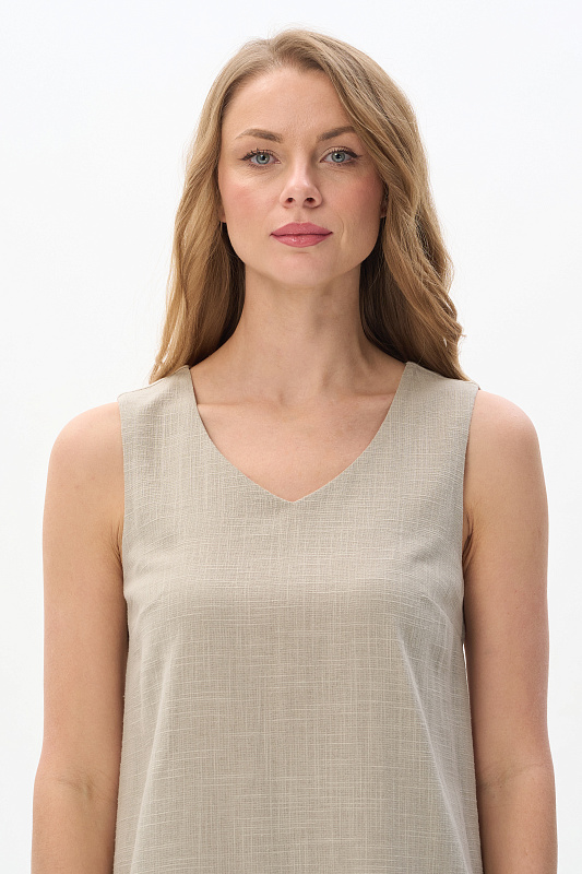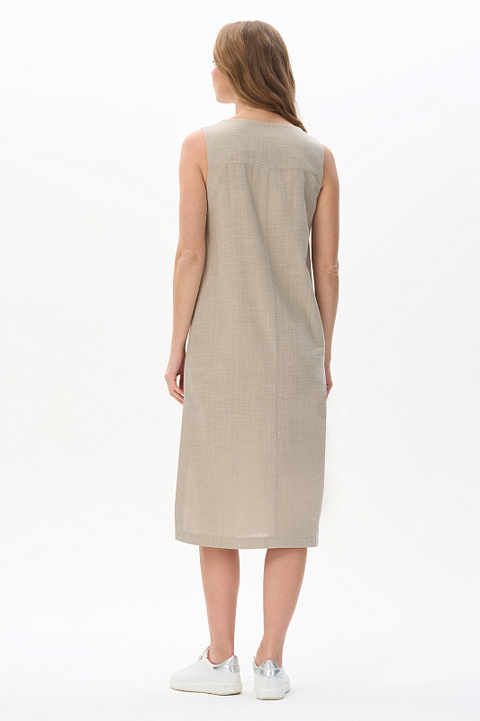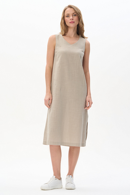 Платье без рукавов из хлопковой фактурной ткани 120 гр в серо-зелёном оттенке. Модель свободная, слегка расширенного силуэта, с вытачками на груди, V-образный вырез горловины, в левом боковом шве разрез, длина до середины икр. Лёгкое комфортное платье для лета, в комплекте с рубашкой из той же ткани создают стильный вариант для офиса, прогулок и уместно в любой ситуации. Рост модели 175 см.