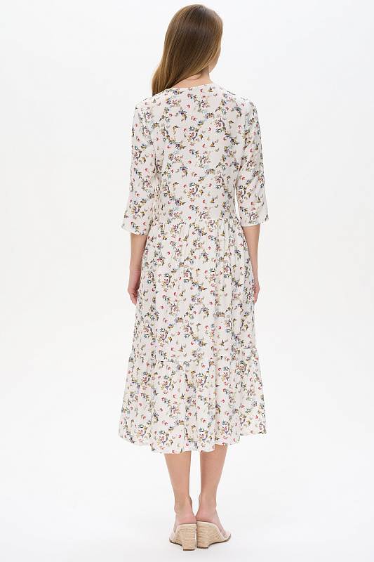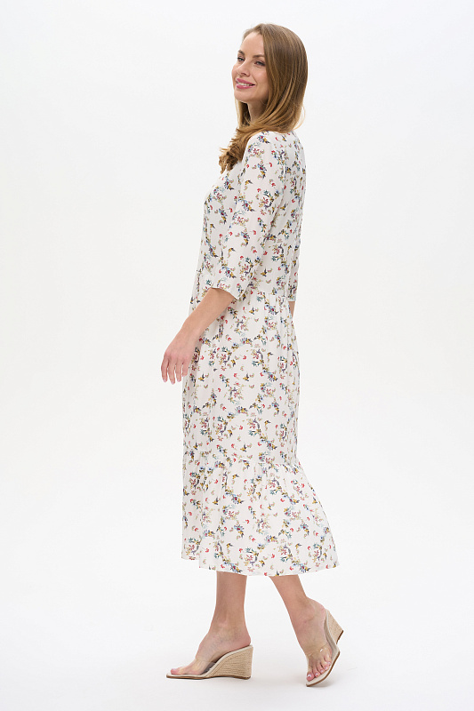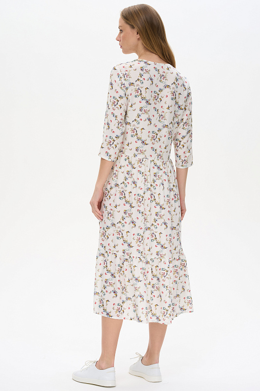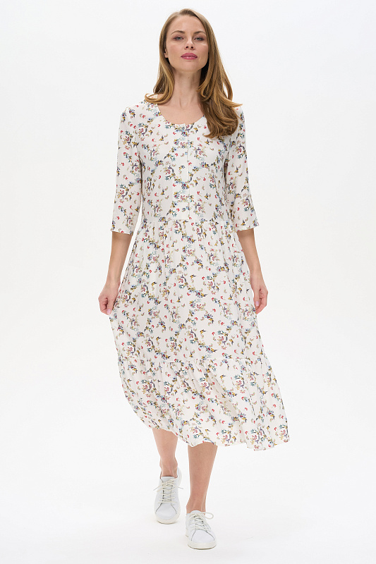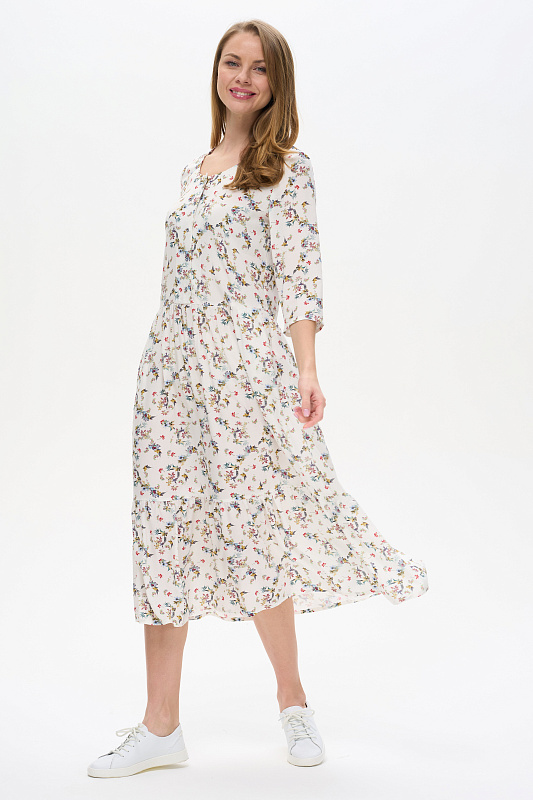 Платье с ярусами из штапеля 120 гр рисунок Яркие цветочки на молочном фоне. Модель свободная, прямого силуэта, круглый вырез горловины, застежка на пуговицы, втачные рукава до локтя, удобные карманы. Очень нежное, женственное платье на любой случай, подходит для города, дома и отдыха. Рост модели 175 см.