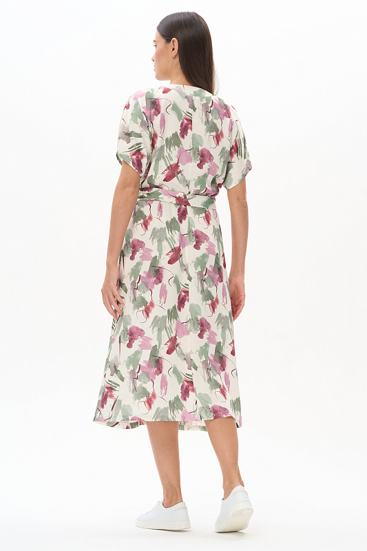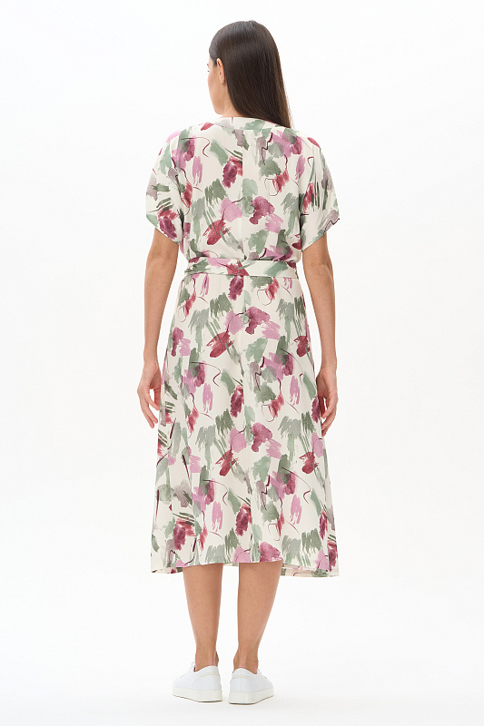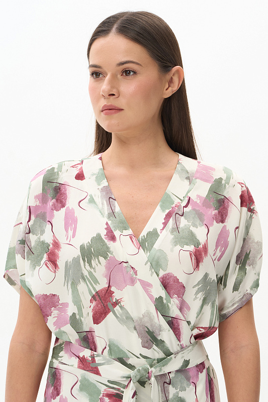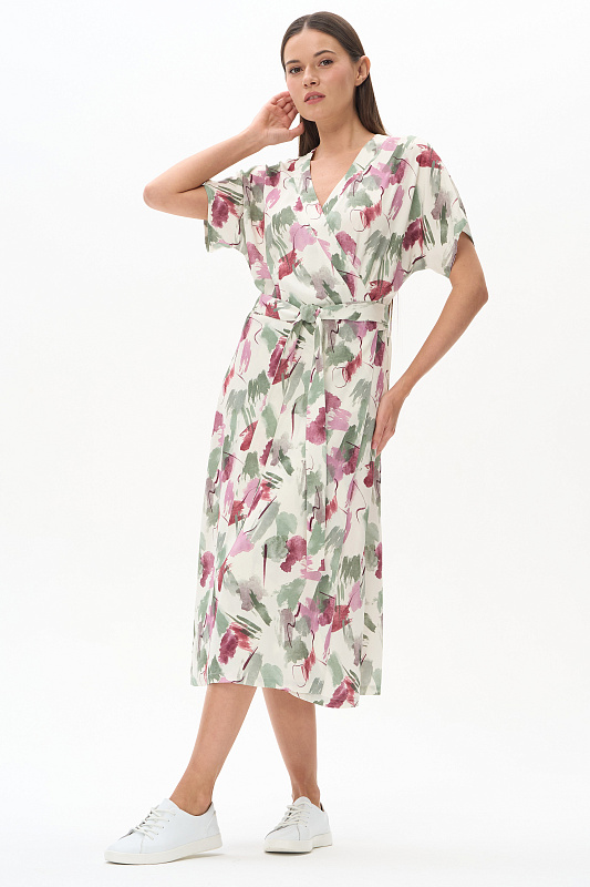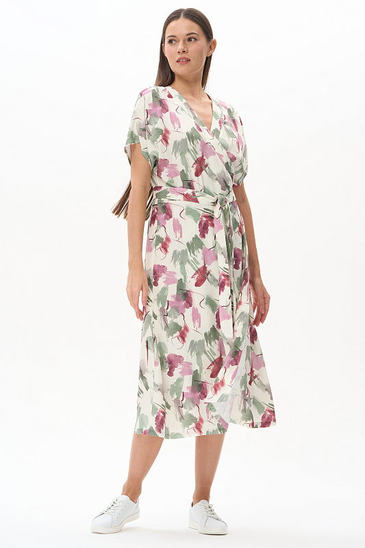 Платье из легкой штапельной ткани 120 гр с Абстрактным рисунком в оттенках коллекции. Модель полуприлегающего силуэта с "запахом", V-образный вырез, спущенная линия плеча, короткие цельнокроеные рукава, широкий пояс. Лёгкое, комфортное платье для повседневных и нарядных образов. Дизайнерский принт ткани выглядит свежо и актуально. Рост модели 175 см